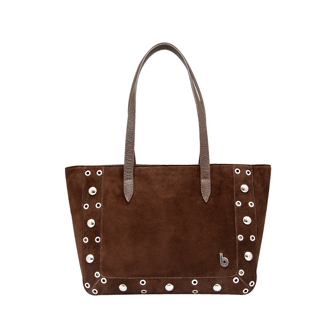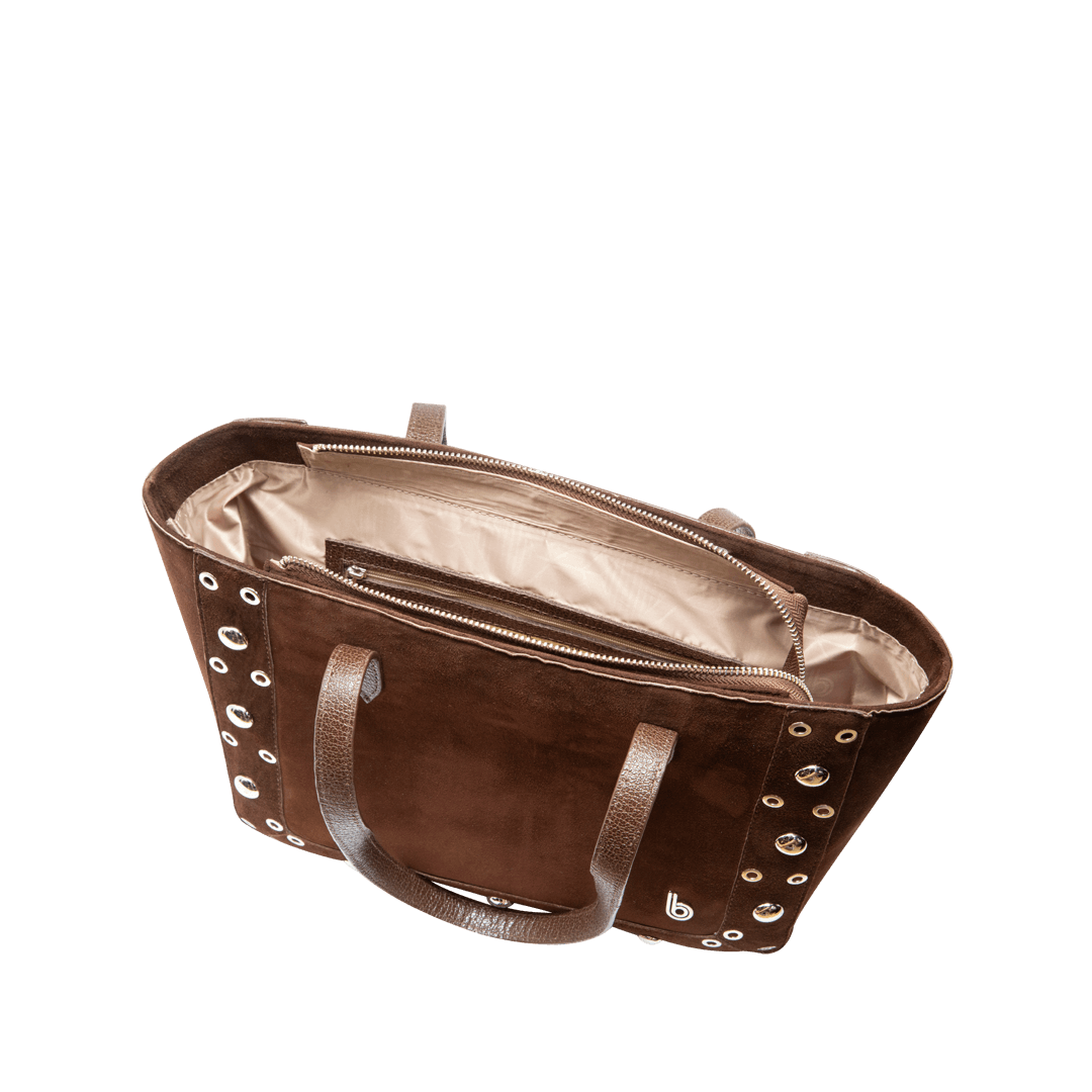 ¡Discreta, pero llena de historia! • Cartera con taches y ojaletes para mujer en cuero gamuza y granito color chocolate • Cierre mediante cremallera • Compartimiento interno con cremallera • Bolsillo auxiliar • Asa corta doble en cuero de 58 cm • Hecho a mano en Colombia.