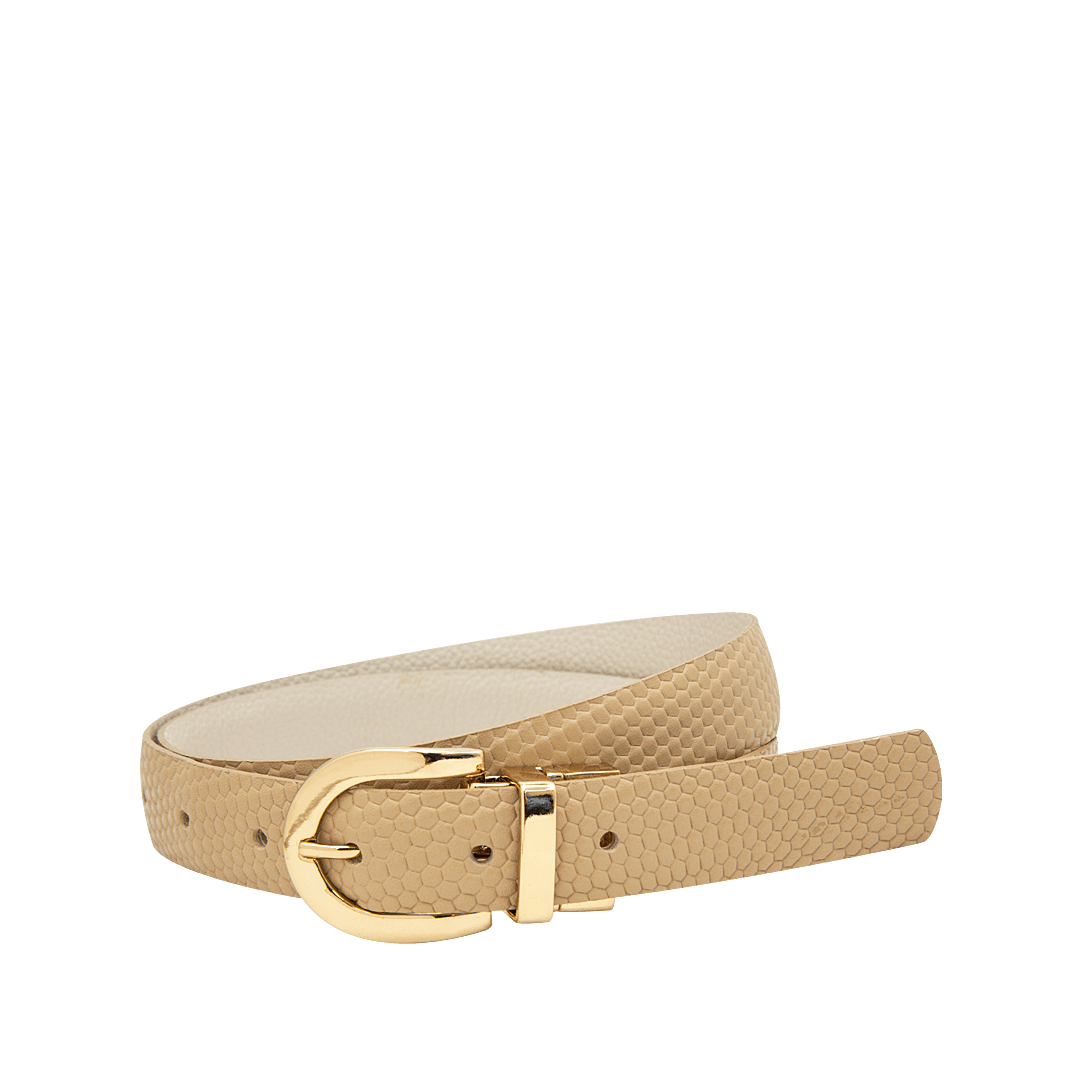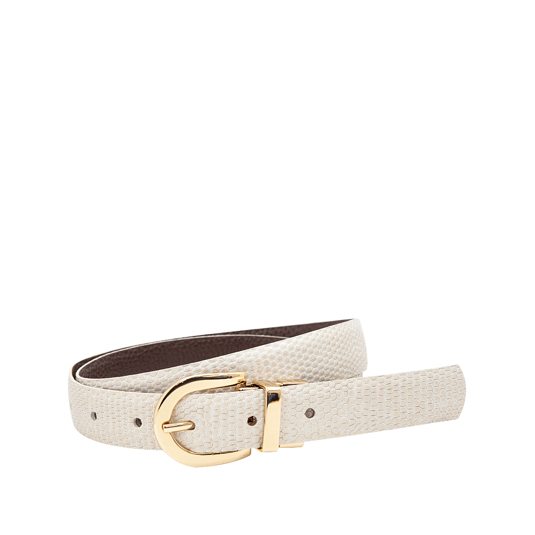 ¡Diseño atemporal que nunca pasa de moda! • Cinturón doble faz para mujer en cuero grabado y granito color capuccino por blanco crema • Hecho a mano en Colombia.