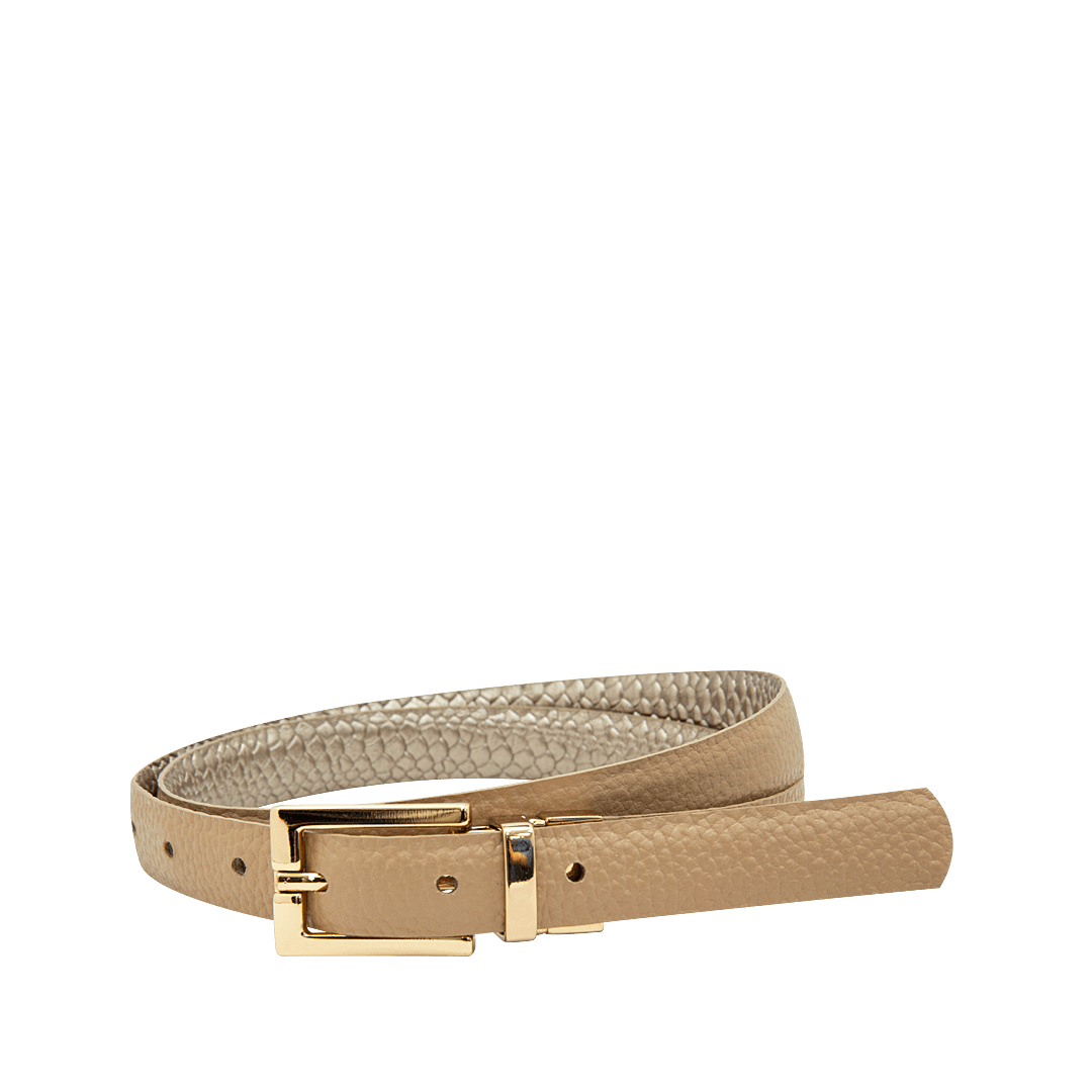 ¡Estilo moderno con un toque relajado! • Cinturón doble faz para mujer en cuero metalizado color metal arena y capuccino • Hecho a mano en Colombia.