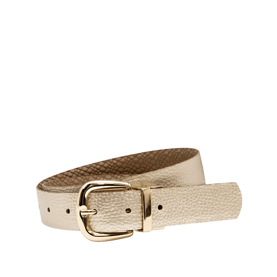 ¡Dale un giro a tu estilo! • Cinturón doble faz para mujer en cuero grabado y granito color miel por oro • Hecho a mano en Colombia.
