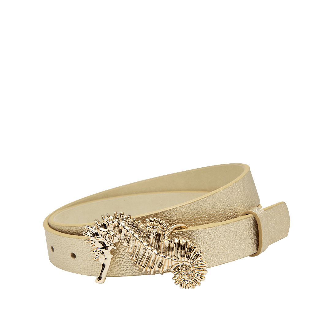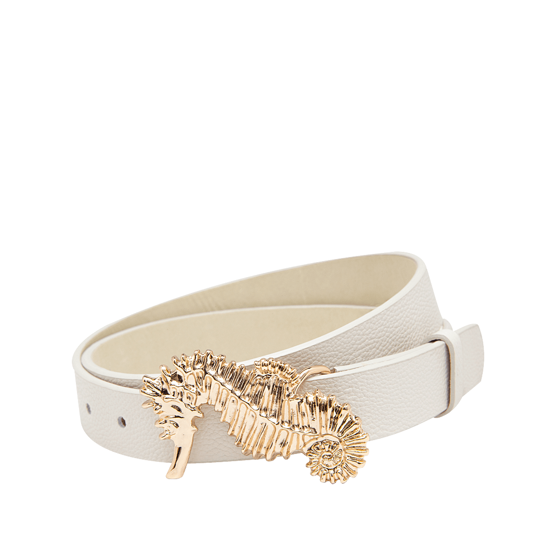 ¡Elegante y con estilo! • Cinturón para mujer en cuero granito color duna • Hebilla metálica en forma de caballo de mar • Hecho a mano en Colombia.