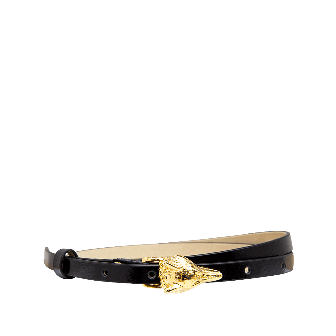 ¡Ligera y delicada! • Cinturón para mujer en cuero liso color negro ónix • Hebilla metálica en forma de zorro • Hecho a mano en Colombia.