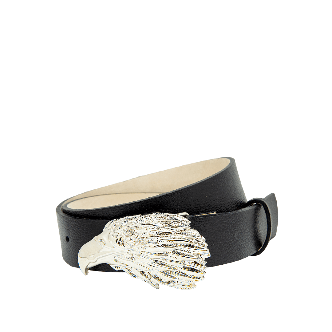 ¡Estilo y personalidad en un solo gesto! • Cinturón para mujer en cuero granito color negro ónix • Hebilla metálica en forma de halcón • Hecho a mano en Colombia.
