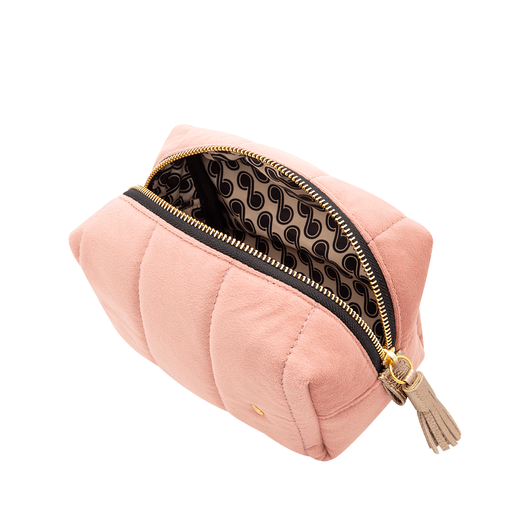 ¡Un accesorio chic que refleja tu buen gusto y amor por los detalles! • Cosmetiquera para mujer en terciopelo color palo rosa • Cierre mediante cremallera con fleco decorativo • Hecho a mano en Colombia.