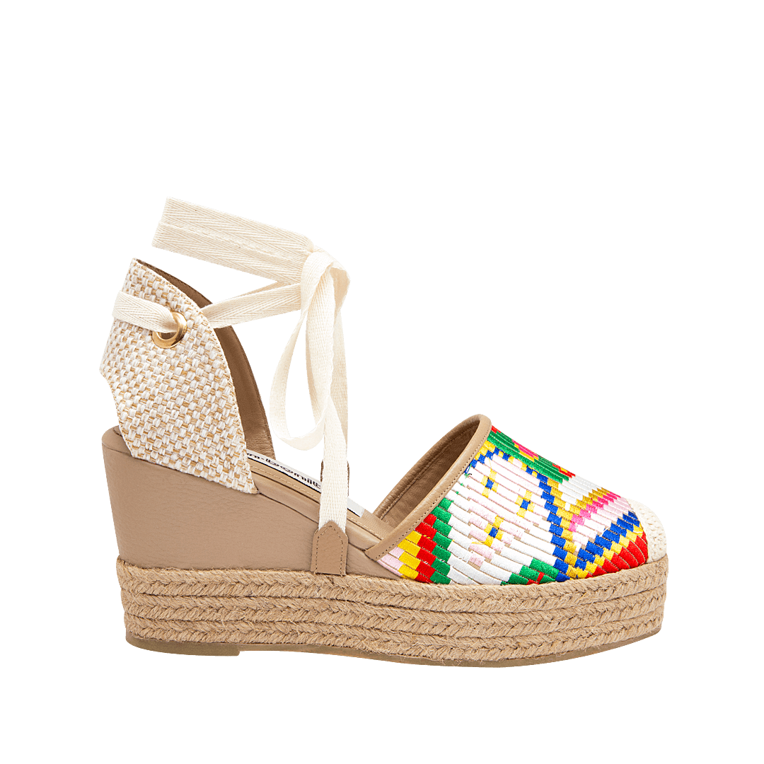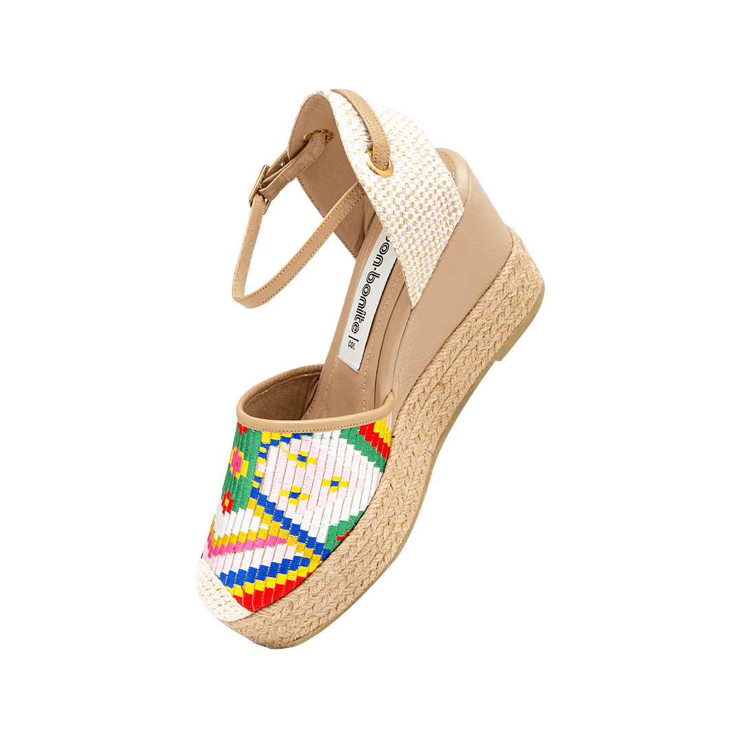 ¡La belleza del cuero artesanal! • Espadrila de plataforma para mujer en textil multicolor • Acabado en punta redonda • Hebilla lateral para mejor ajuste • Cuenta con dos opciones de amarre: cordones de algodón o pasador en cuero con hebilla • Talón descubierto • Plataforma forrada en yute • Hecho a mano en Colombia.