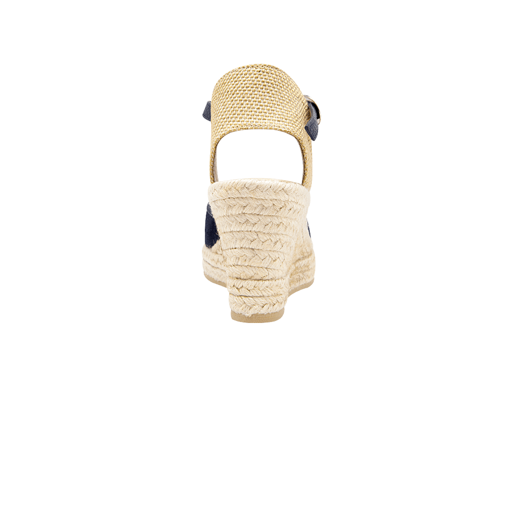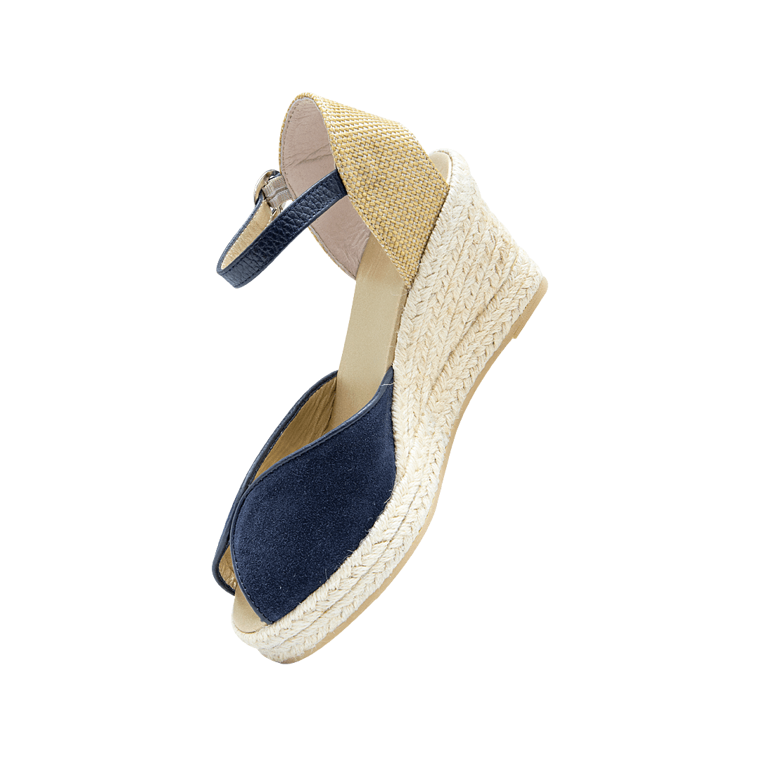 ¡Fresca y elegante! • Espadrila para mujer en cuero carnaza color azul indigo • Acabado en punta ovalada • Hebilla lateral para mejor ajuste • Talonera en textil • Plataforma forrada en yute natural • Hecho a mano en Colombia.