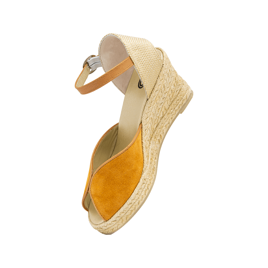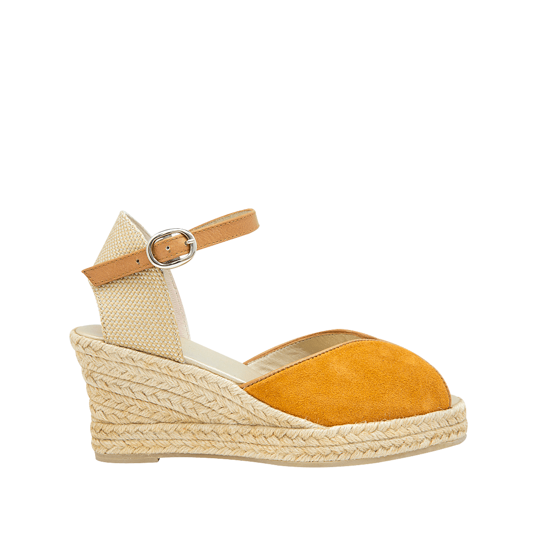 ¡Fresca y elegante! • Espadrila para mujer en cuero carnaza color jewel • Acabado en punta ovalada • Hebilla lateral para mejor ajuste • Talonera en textil • Plataforma forrada en yute natural • Hecho a mano en Colombia.