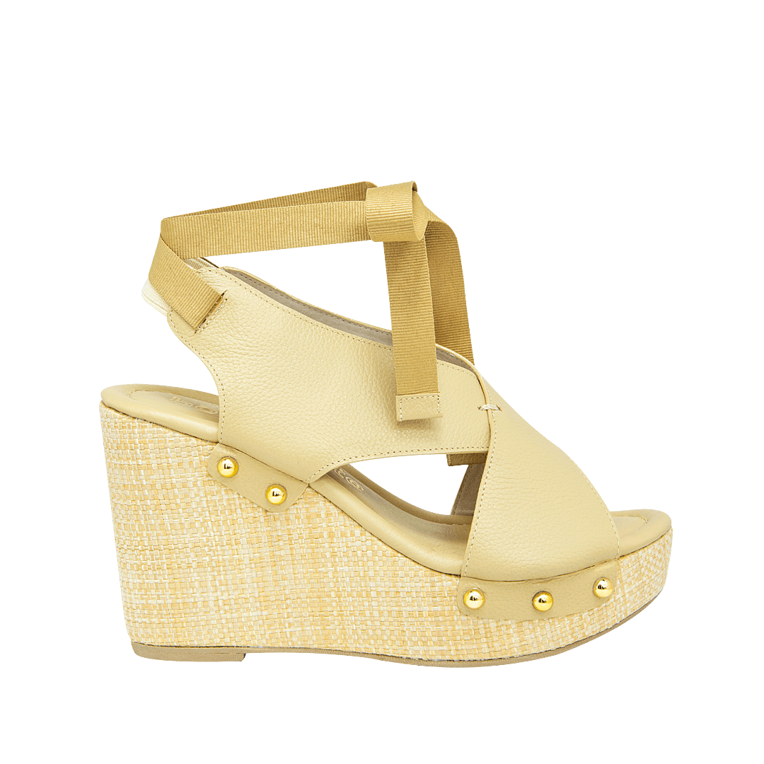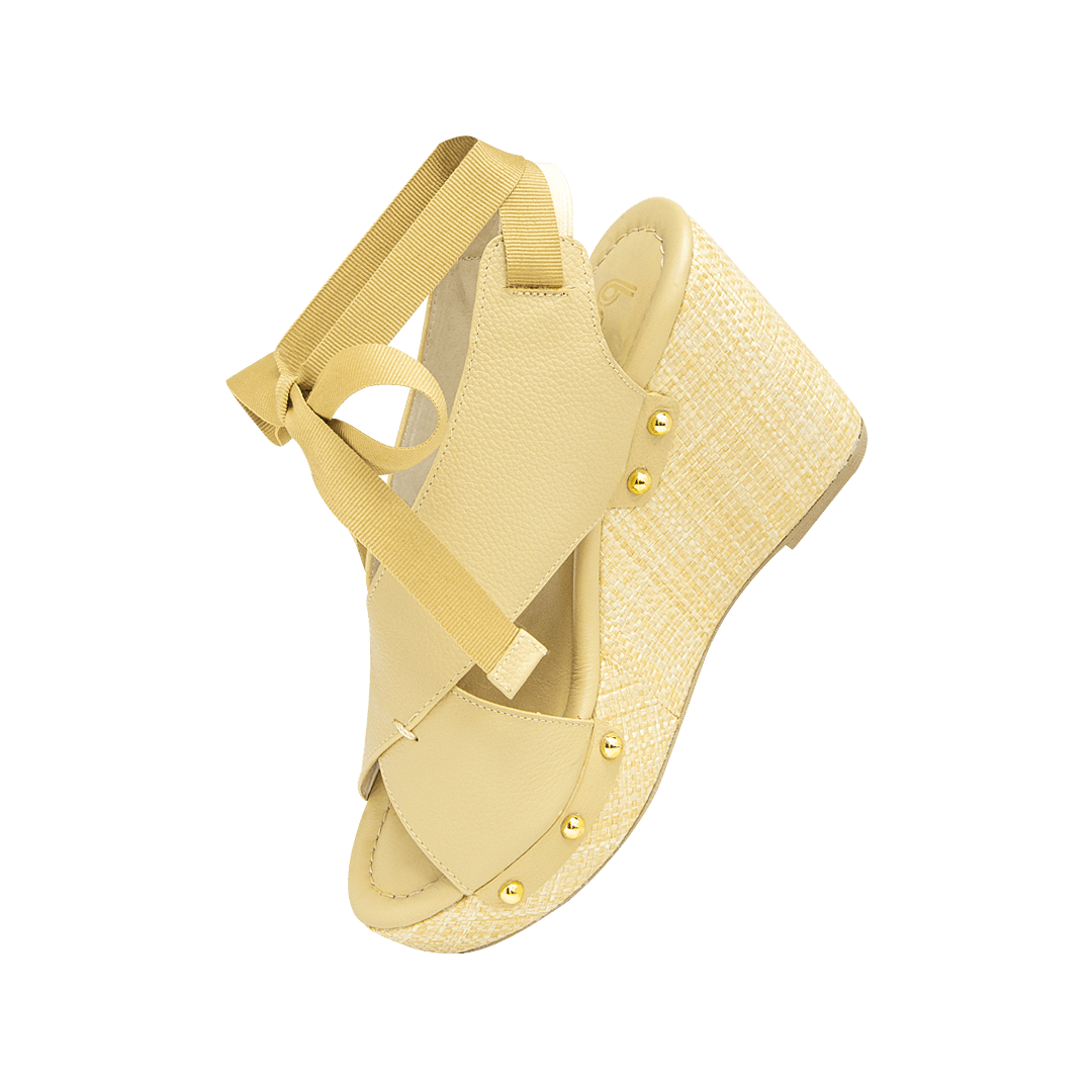 ¡Las mejores cómplices! • Espadrila de plataforma para mujer en cuero color mantequilla • Acabado en punta ovalada • Cordón en textil • Plataforma forrada en rafia textil con taches decorativos • Hecho a mano en Colombia.