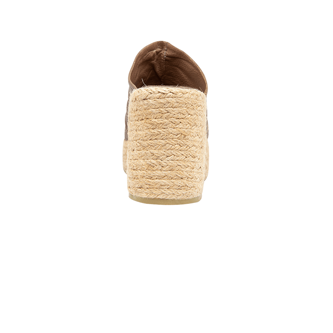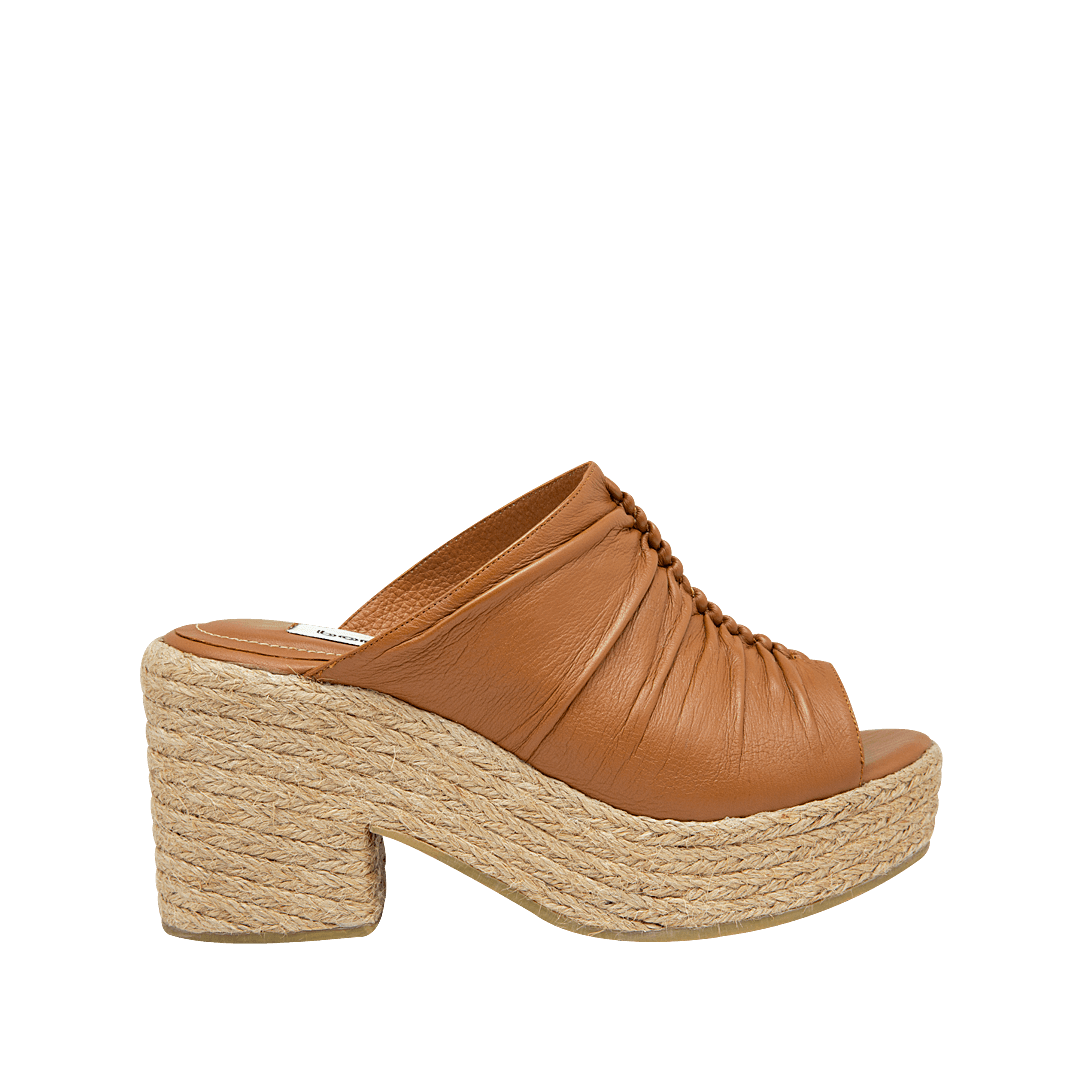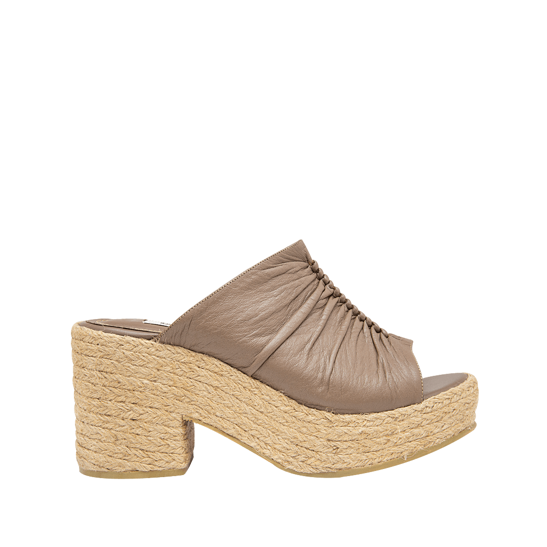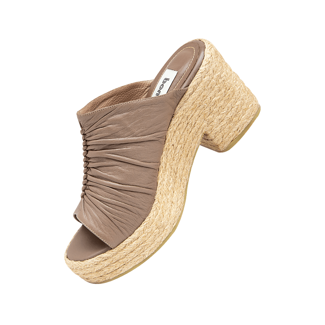 ¡Perfectas para las que aman marcar la diferencia! • Espadrila tipo zueco de tacón para mujer en cuero drapeado confección color tope • Acabado en punta ovalada • Tacón y plataforma forrada en yute • Hecho a mano en Colombia.