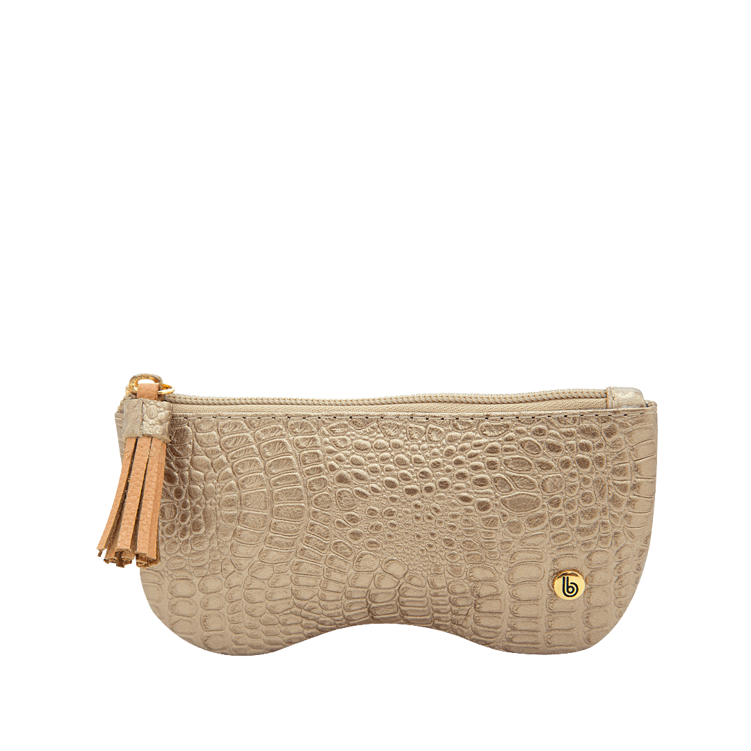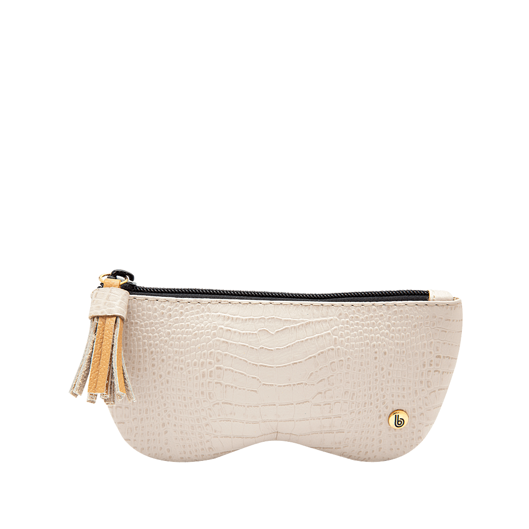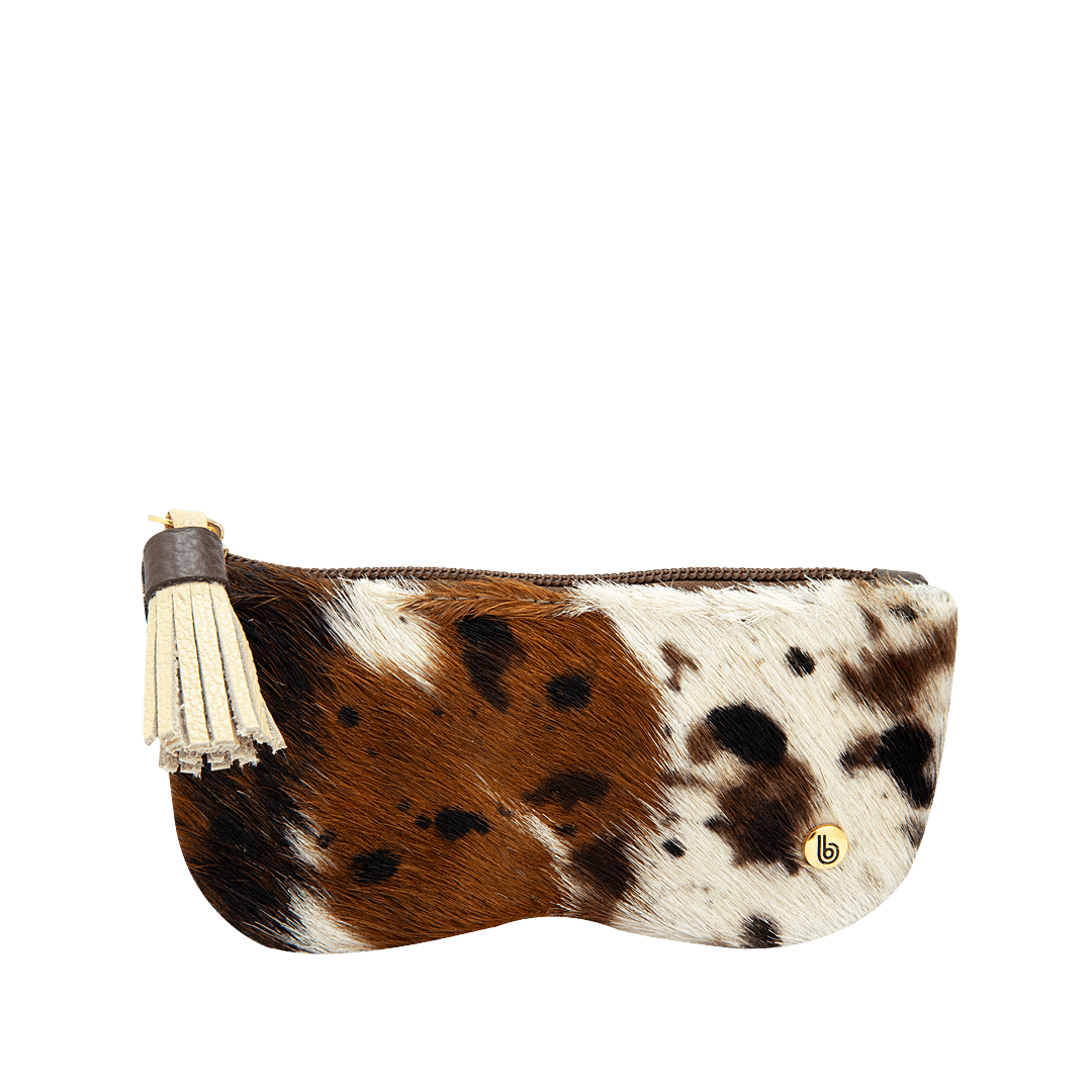 ¡Ve el mundo con claridad, lleva siempre tus gafas contigo! • Estuche para gafas en cuero con acabado en pelo animal print estampado vaca y granito • Cierre mediante cremallera con fleco en cuero color mantequilla • Hecho a mano en Colombia.