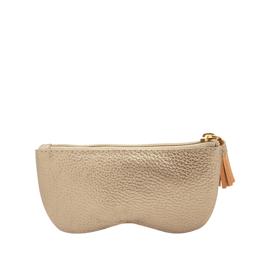 ¡Ve el mundo con claridad, lleva siempre tus gafas contigo! • Estuche para gafas en cuero metalizado y grabado color luna • Cierre mediante cremallera con fleco en cuero color melón • Hecho a mano en Colombia.