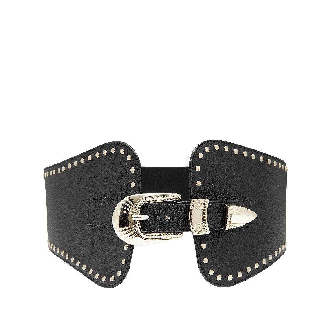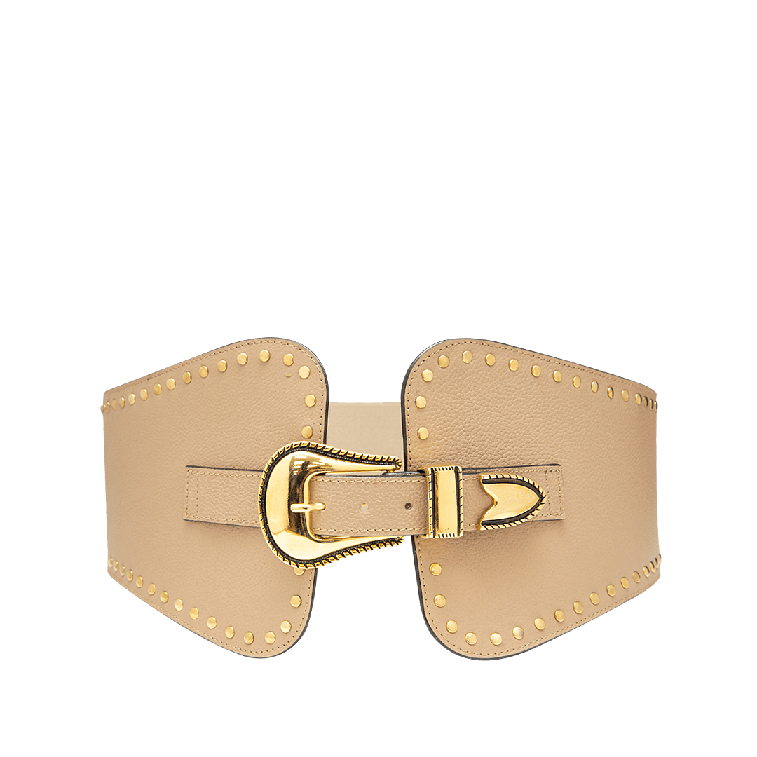 ¡Realza tu figura! • Fajón en cuero granito con taches decorativos color capuccino • Elástico trasero para mejor ajuste • Hecho a mano en Colombia.