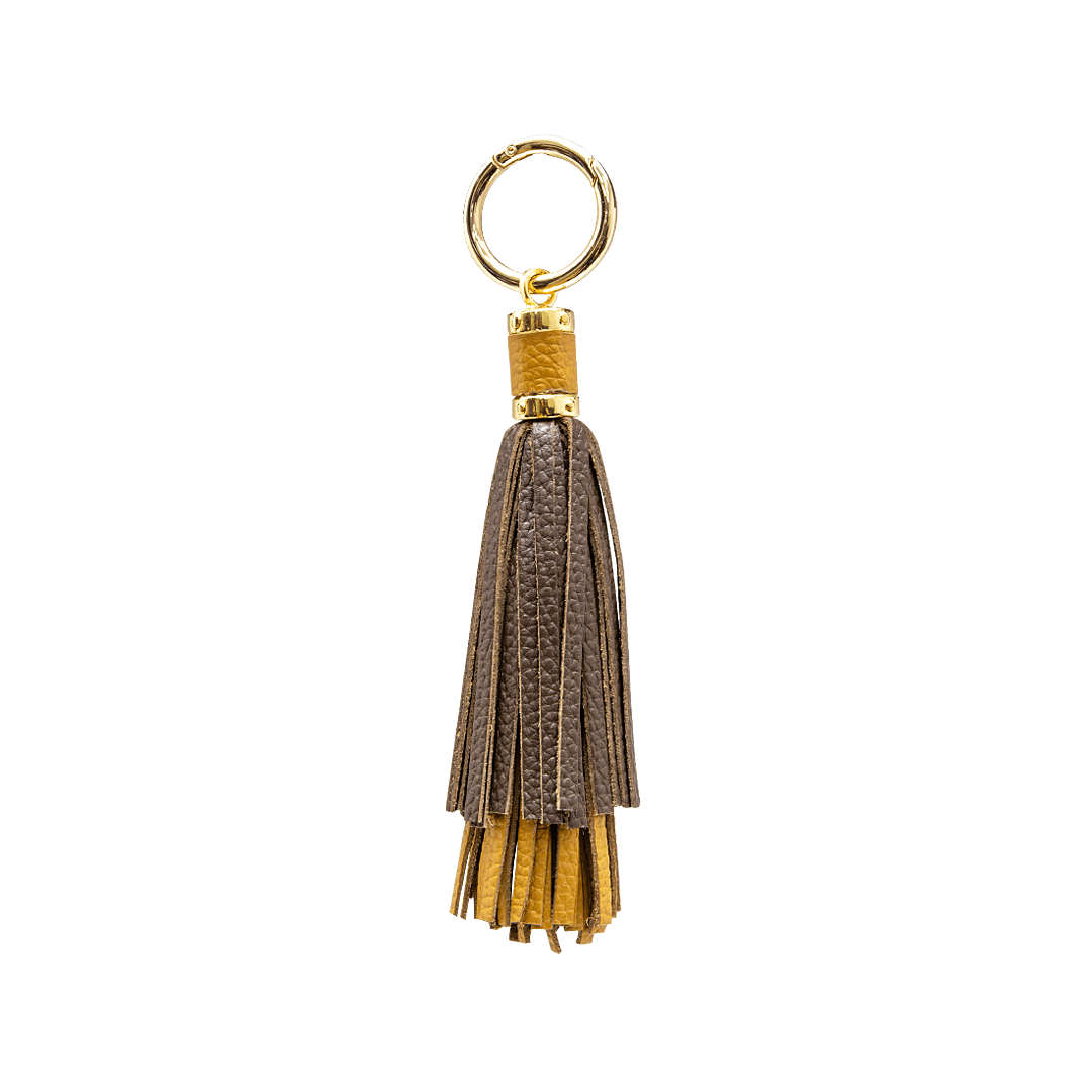 ¡Versátil y único! • Llavero en flecos para mujer en cuero granito color cacao por mostaza • Hecho a mano en Colombia.