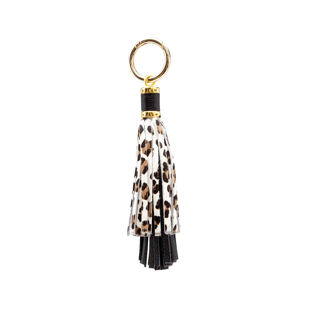¡Versátil y único! • Llavero en flecos para mujer en cuero con acabado en pelo animal print y granito color negro ónix • Hecho a mano en Colombia.