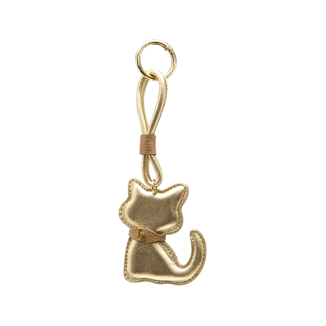 ¡Lleva contigo lo que amas! • Llavero en forma de gato en cuero metalizado color oro nuevo por miel abeja • Hecho a mano en Colombia.