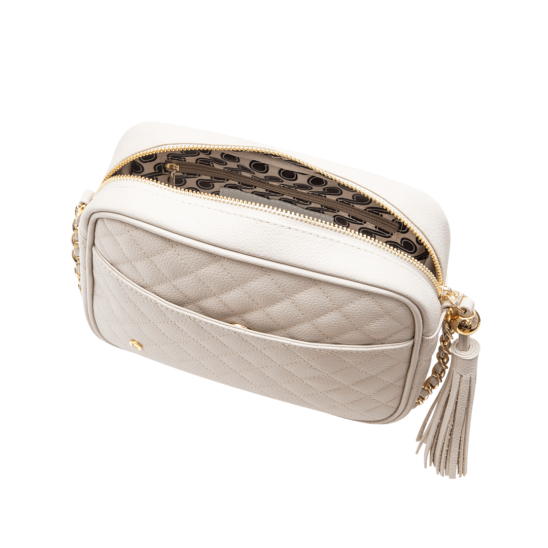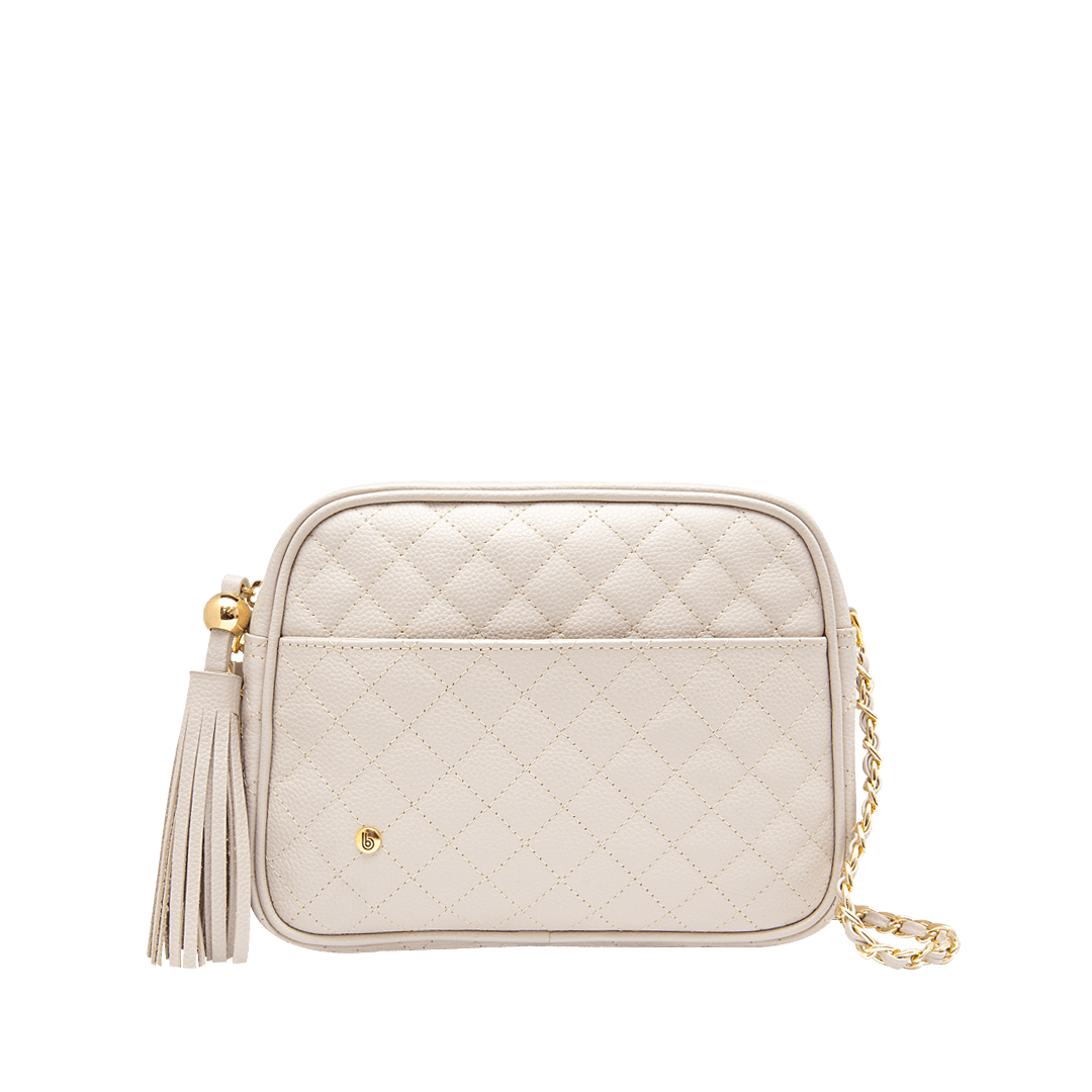 ¡Un reflejo de elegancia y buen gusto! • Manos libres para mujer chaneleado en cuero color blanco arena • Cierre con fleco decorativo mediante cremallera • Compartimiento externo con pin • Bolsillo interno con cremallera • Bolsillo interno auxiliar • Asa larga en cuero y cadena de 119 cm • Hecho a mano en Colombia.