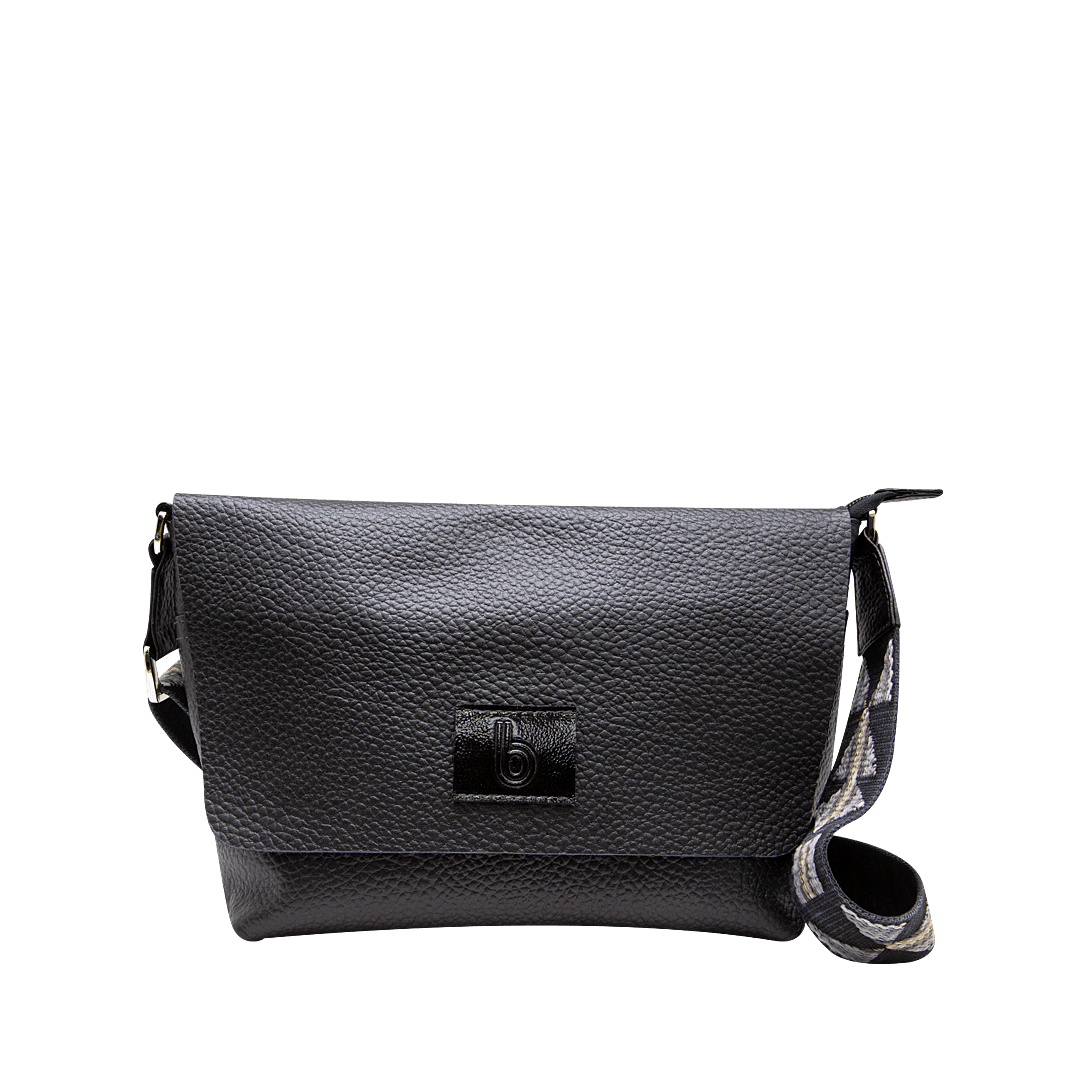 ¡Para el día a día! • Manos libres para mujer en cuero granito color negro ónix • Cierre con tapa mediante pin y cremallera • Bolsillo interno con cremallera • Dos bolsillos auxiliares internos y uno externo • Reata larga y ajustable en textil de 119,5 cm • Hecho a mano en Colombia.