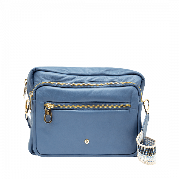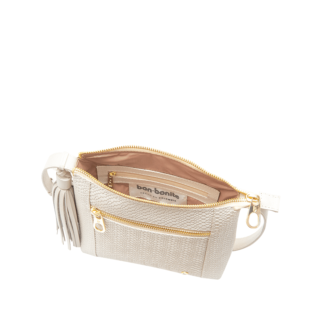 ¡Perfecto y práctico! • Manos libres para mujer en cuero grabado color blanco arena • Cierre mediante cremallera • Fleco lateral decorativo • Bolsillo interno y frontal con cremallera • Asa larga ajustable de 117 cm • Hecho a mano en Colombia.