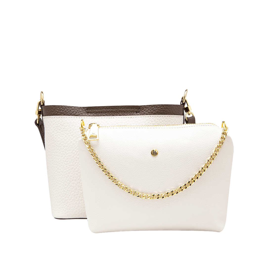 ¡Su diseño habla por sí solo! • Manos libres multifuncional para mujer en cuero granito color blanco crema por cacao • Cierre mediante pin • Bolso principal con bolsillo interno mediante cremallera • Cadena corta de 31 cm • Asa larga ajustable y removible de 117 • Hecho a mano en Colombia.