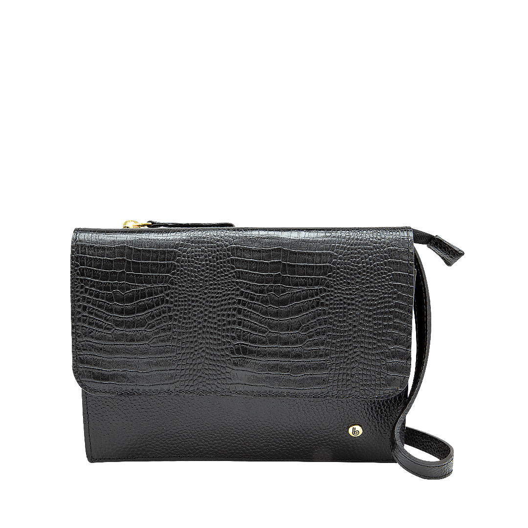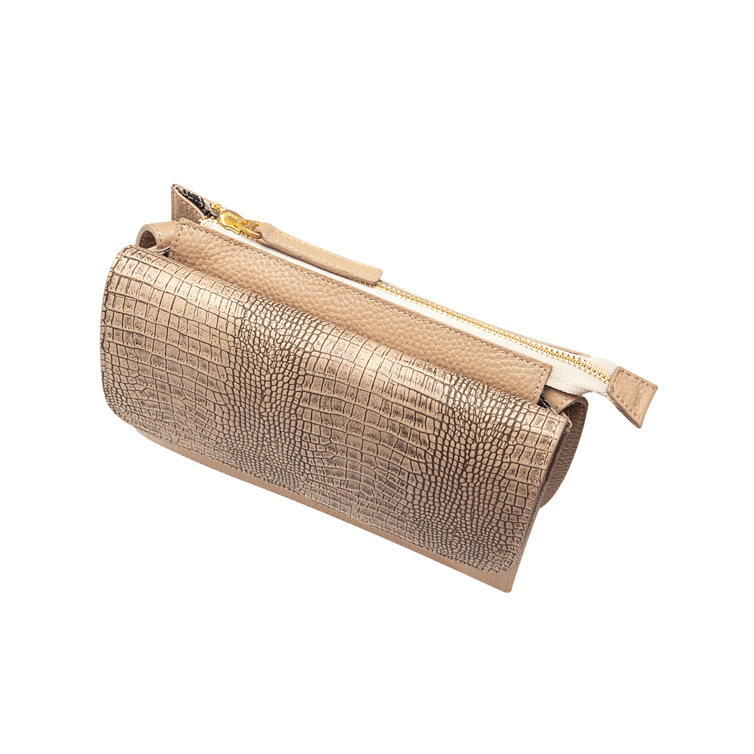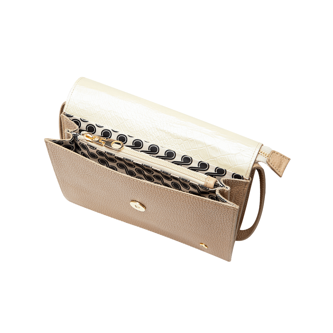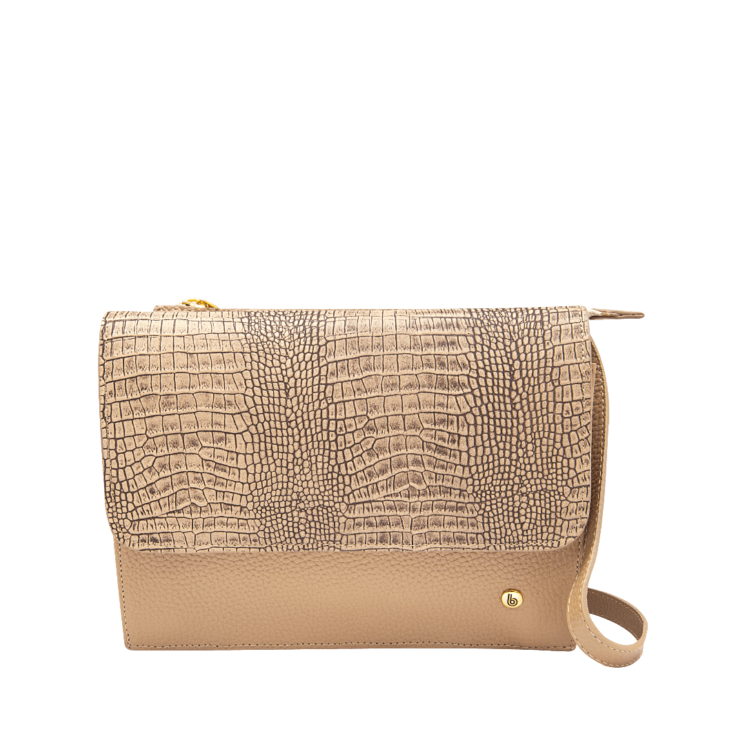 ¡Femenino y sofisticado! • Manos libres para mujer en mezcla de cuero grabado y granito color capuccino • Cierre con tapa mediante pin • Bolsillo interno y externo con cierre mediante cremallera • Dos compartimientos • Asa larga ajustable de 140 cm • Hecho a mano en Colombia.