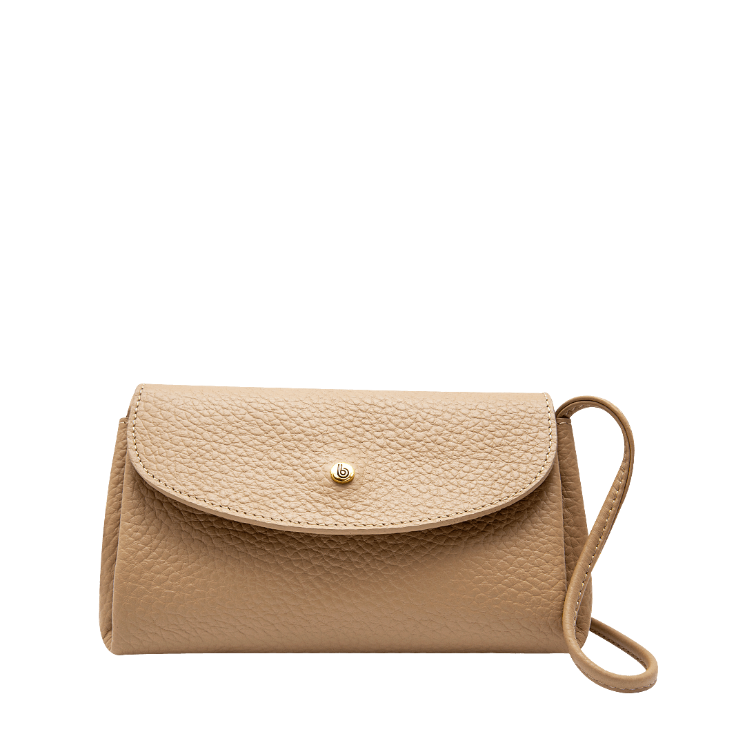 ¡Mini cartera, máxima versatilidad! • Manos libres en cuero granito color capuccino • Con tapa y pin • Forro en textil • Asa larga ajustable de 120 cm • Hecho a mano en Colombia.