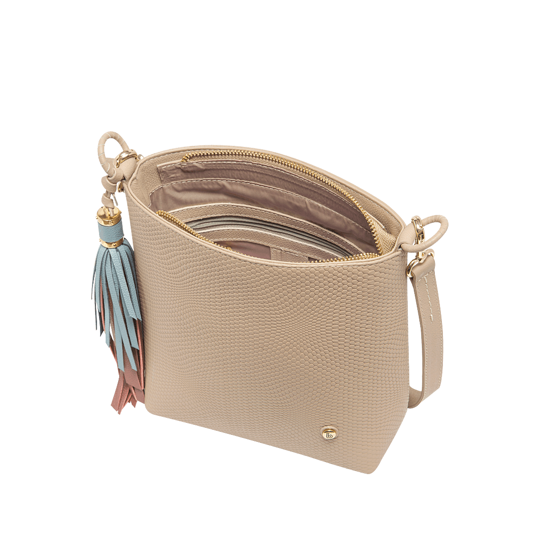 ¡Un infaltable! • Manos libres color capuccino • Cuero granito • Cierre mediante cremallera • Compartimiento interno • Forro en textil • Asa larga ajustable • Accesorio en flecos colorido • Placa con la letra «b» de nuestro logo • Hecho a mano en Colombia.