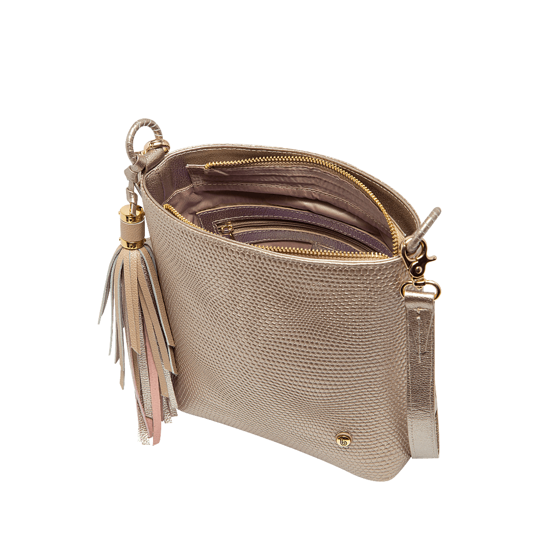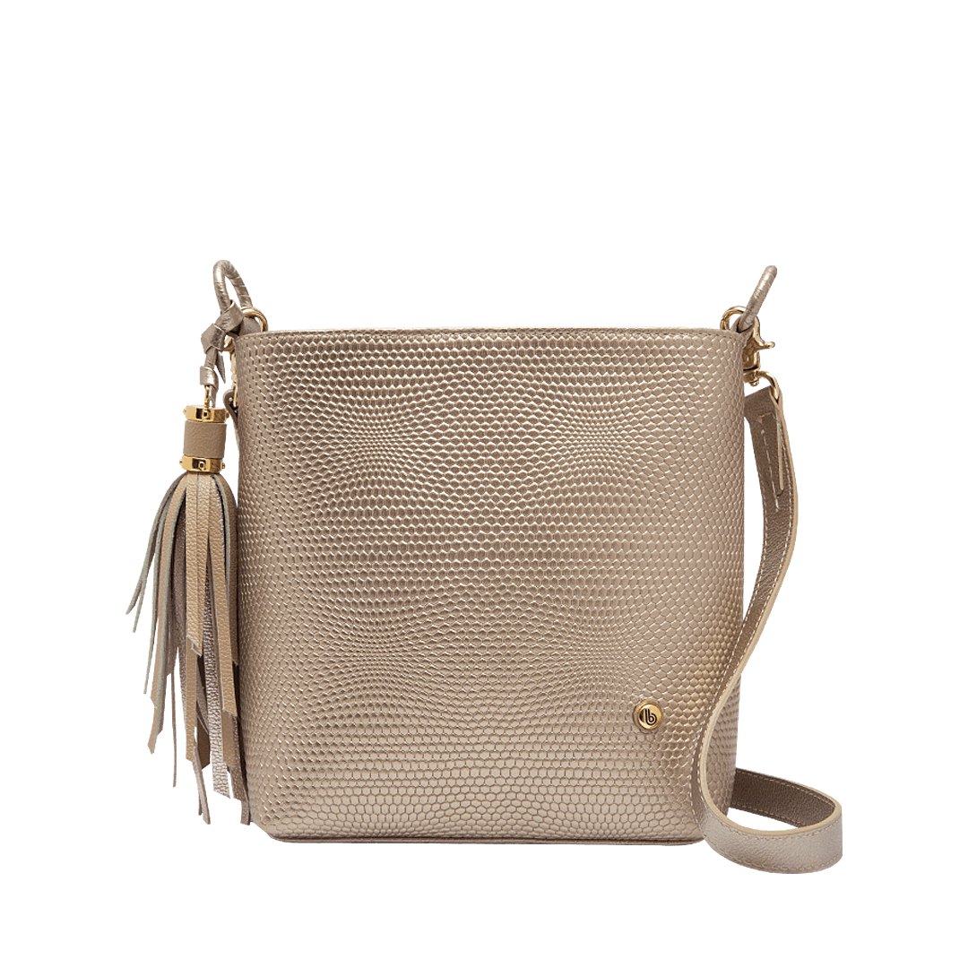 ¡Un infaltable! • Manos libres color metal arena • Cuero granito • Cierre mediante cremallera • Compartimiento interno • Forro en textil • Asa larga ajustable • Accesorio en flecos colorido • Placa con la letra «b» de nuestro logo • Hecho a mano en Colombia.