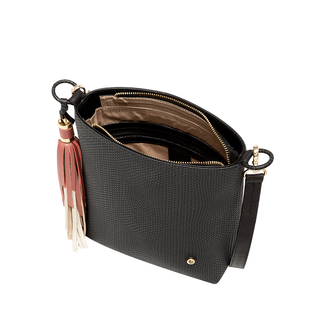 ¡Un infaltable! • Manos libres color negro mate • Cuero granito • Cierre mediante cremallera • Compartimiento interno • Forro en textil • Asa larga ajustable • Accesorio en flecos colorido • Placa con la letra «b» de nuestro logo • Hecho a mano en Colombia.