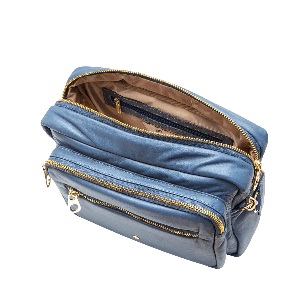 ¡Listo para todo! • Manos libres para mujer en cuero confección color azul luna • Cierre mediante cremallera • Bolsillo interno con cremallera • Dos compartimientos frontales con cremallera • Reata larga ajustable y removible de 124 cm • Hecho a mano en Colombia.