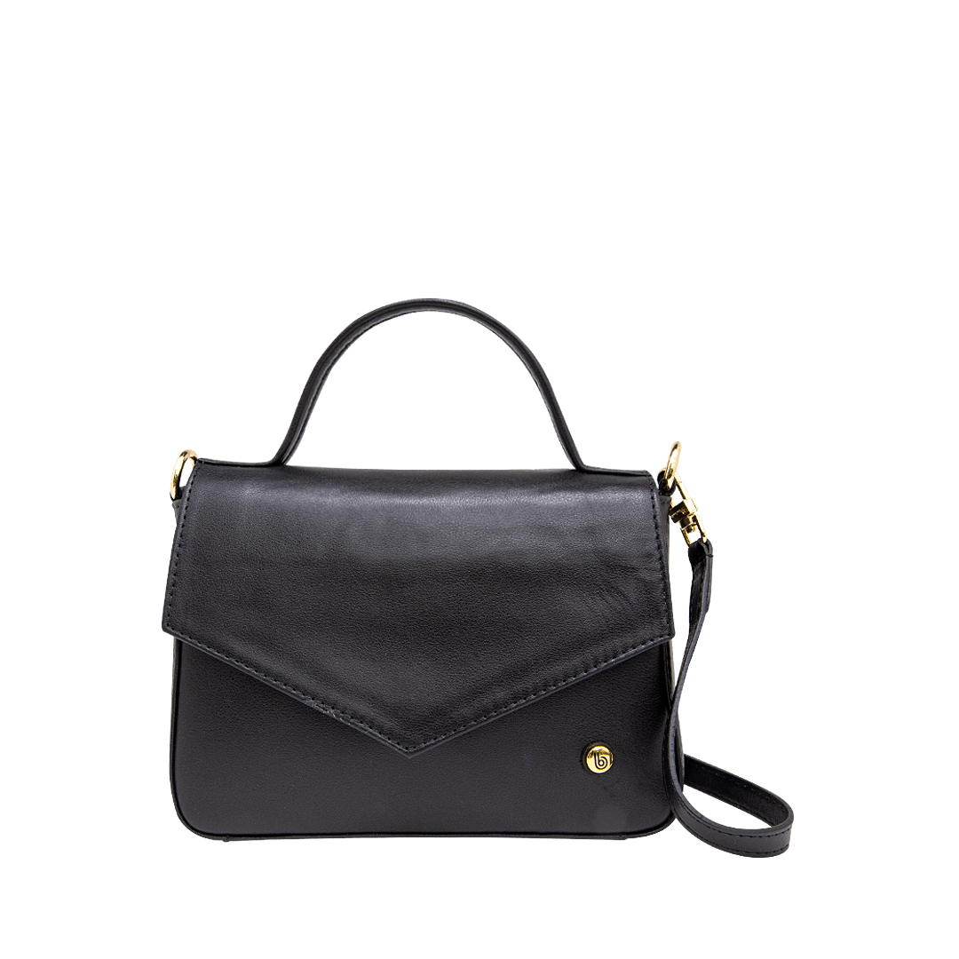 ¡Pequeña, práctica y llena de personalidad! • Manos libres para mujer en cuero liso color negro ónix • Cierre con tapa y pin • Bolsillo interno con cremallera • Asa corta de 19 cm • Asa larga removible de 118 cm • Hecho a mano en Colombia.