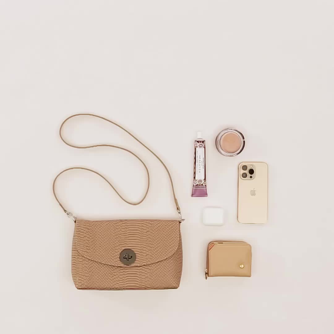 ¡Lleva lo esencial con estilo! • Manos libres para mujer en cuero grabado color pardo • Cierre con tapa mediante pin • Un compartimiento interno con cierre mediante cremallera • Asa larga removible de 109 cm • Hecho a mano en Colombia.