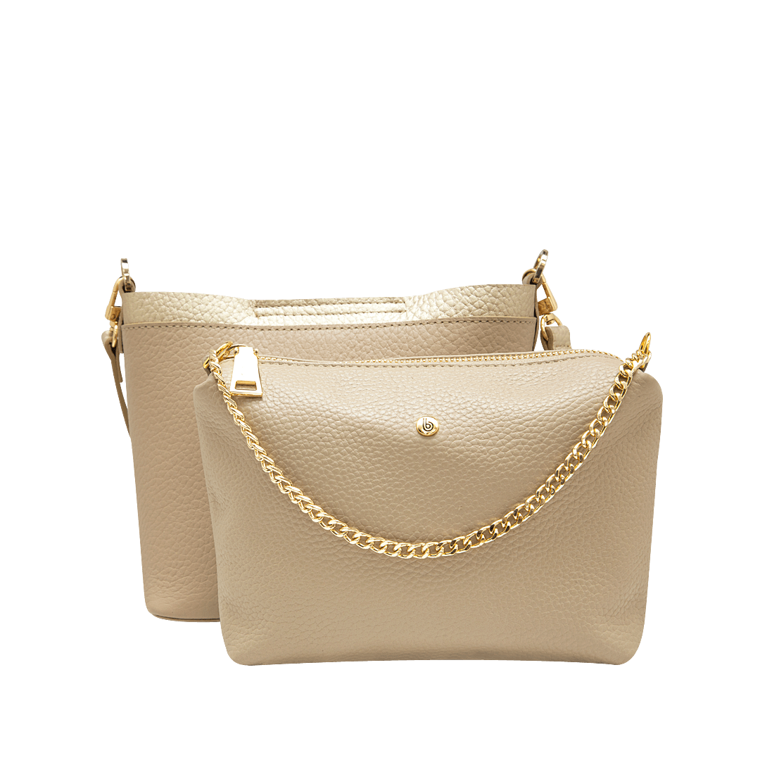 ¡Su diseño habla por sí solo! • Manos libres multifuncional para mujer en cuero granito color pardo por oro nuevo • Cierre mediante pin • Bolso principal con bolsillo interno mediante cremallera • Cadena corta de 31 cm • Asa larga ajustable y removible de 117 • Hecho a mano en Colombia.