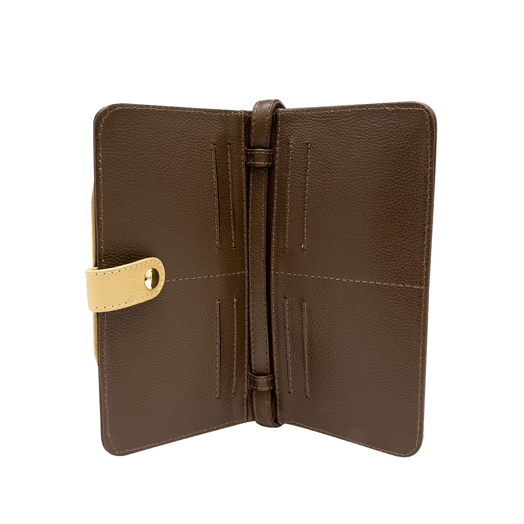 Manos libres tipo billetera en cuero cacao por mantequilla