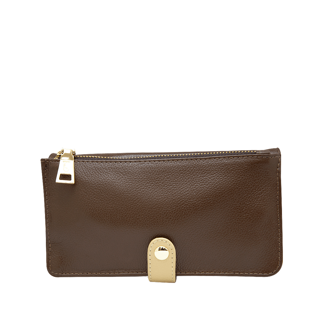 ¡Para las mujeres que saben que menos es más! • Manos libres tipo billetera para mujer en cuero granito color cacao por mantequilla • Compartimiento frontal con cierre mediante pin • Compartimiento con cierre mediante cremallera • Ocho compartimiento para tarjetas • Dos bolsillos auxiliares • Asa larga ajustable de 158 cm • Hecho a mano en Colombia.
