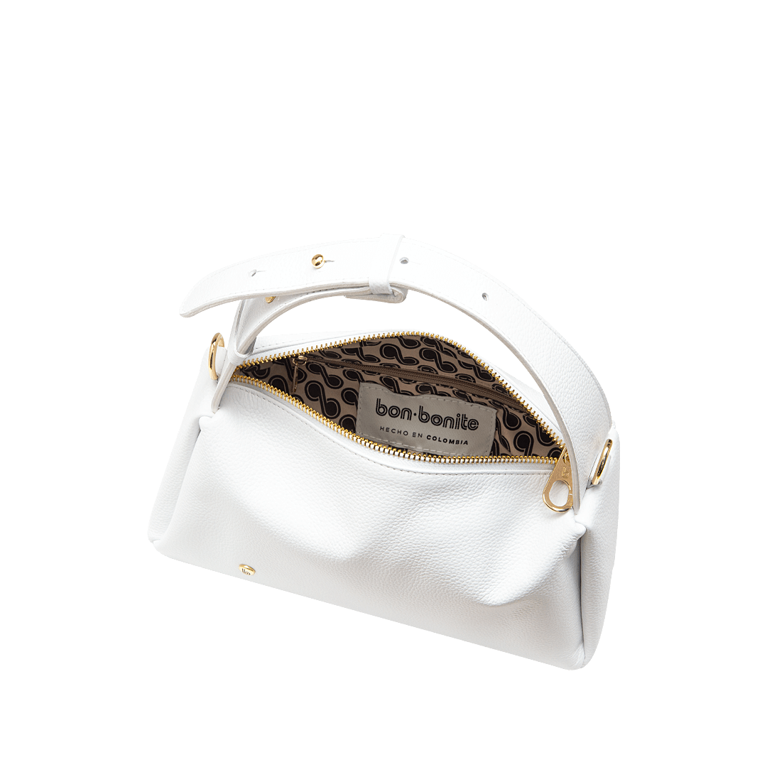 ¡Ligera pero con presencia! • Mini cartera para mujer en cuero granito color blanco puro • Cierre mediante cremallera • Un compartimiento interno y trasero con cremallera • Asa corta ajustable de 41 cm • Asa larga ajustable y removible de 116 cm • Hecho a mano en Colombia.