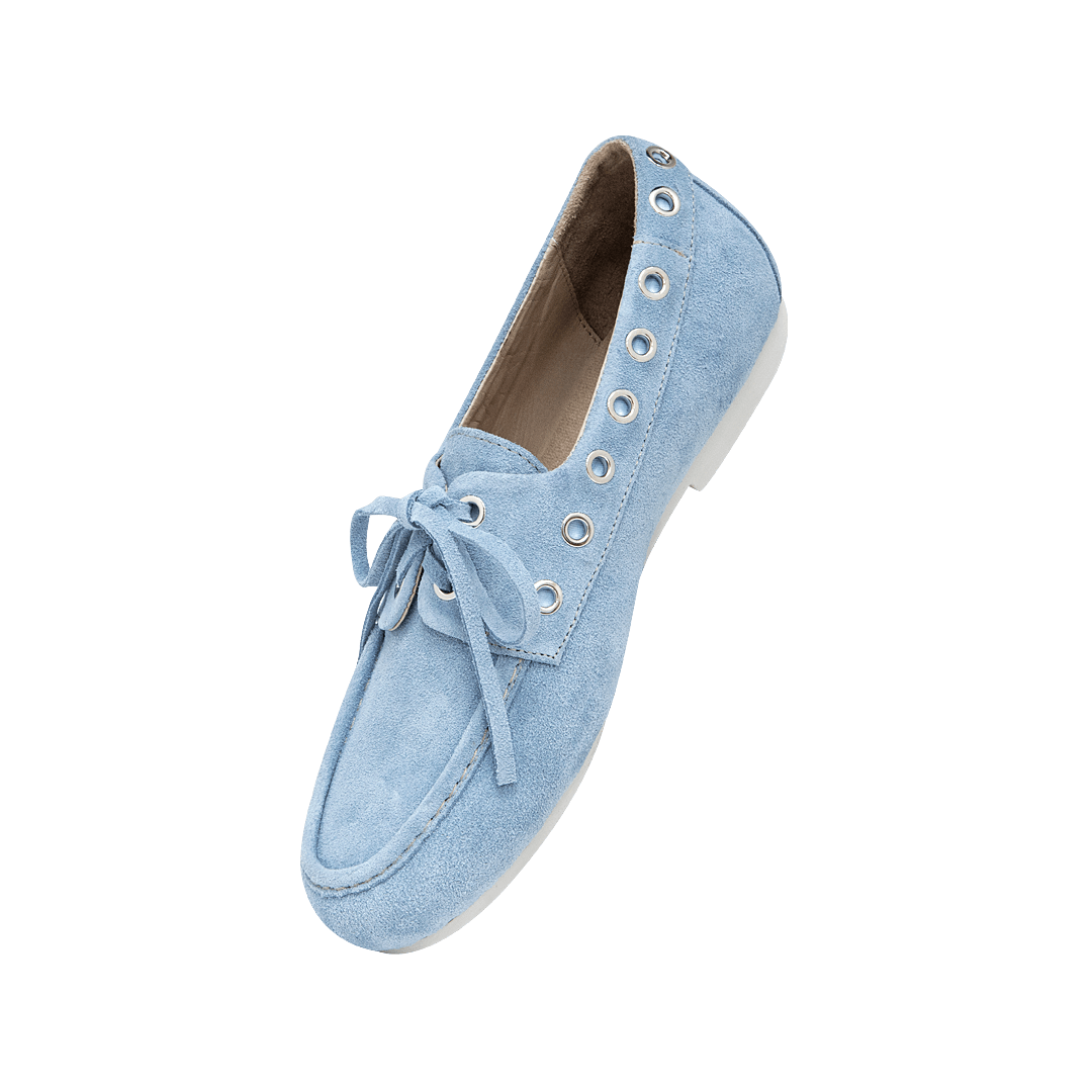¡Tu mejor aliado! • Náutico para mujer en cuero carnaza con ojaletes decorativos color sky • Cordón en cuero • Acabado en punta ovalada • Mini tacón en caucho • Hecho a mano en Colombia.