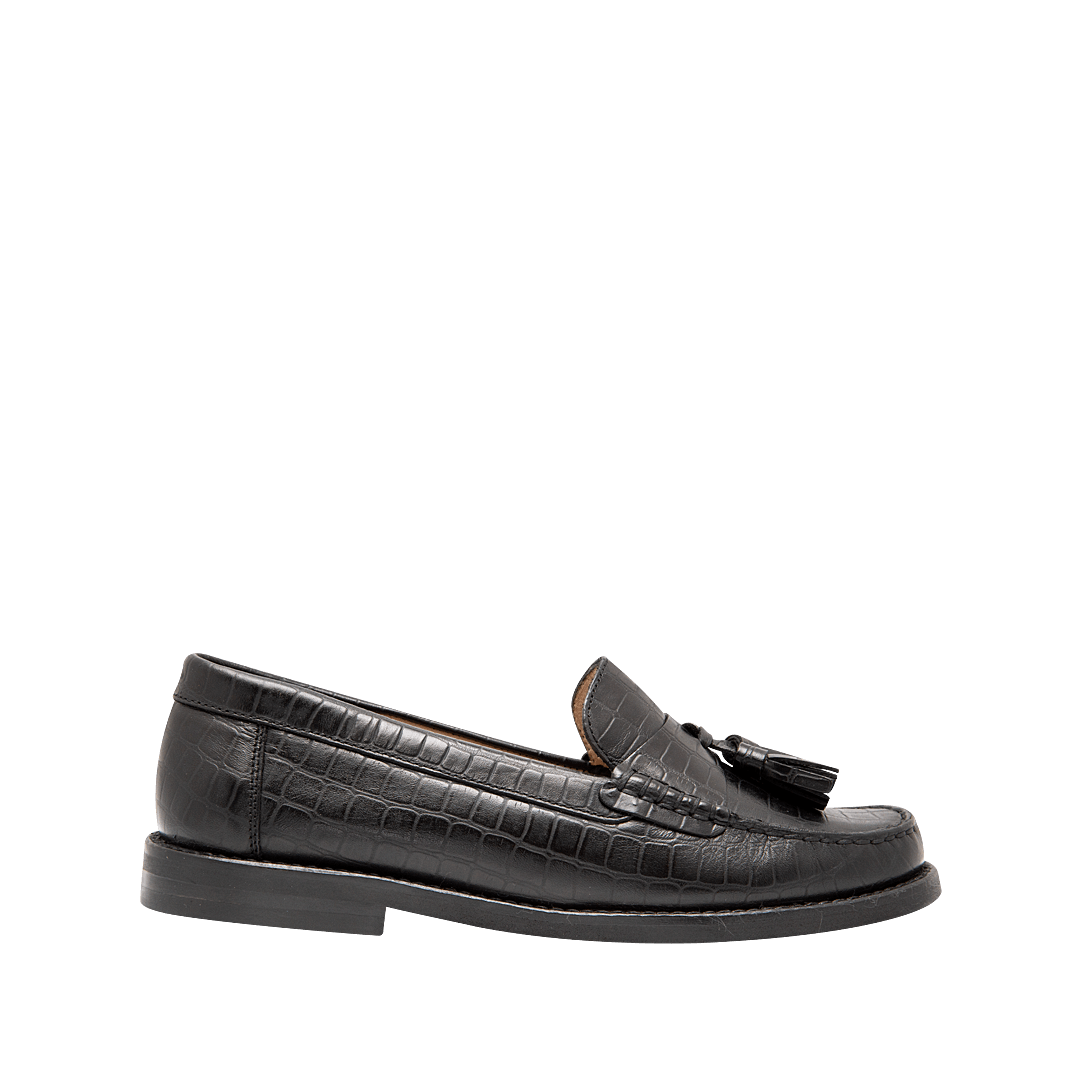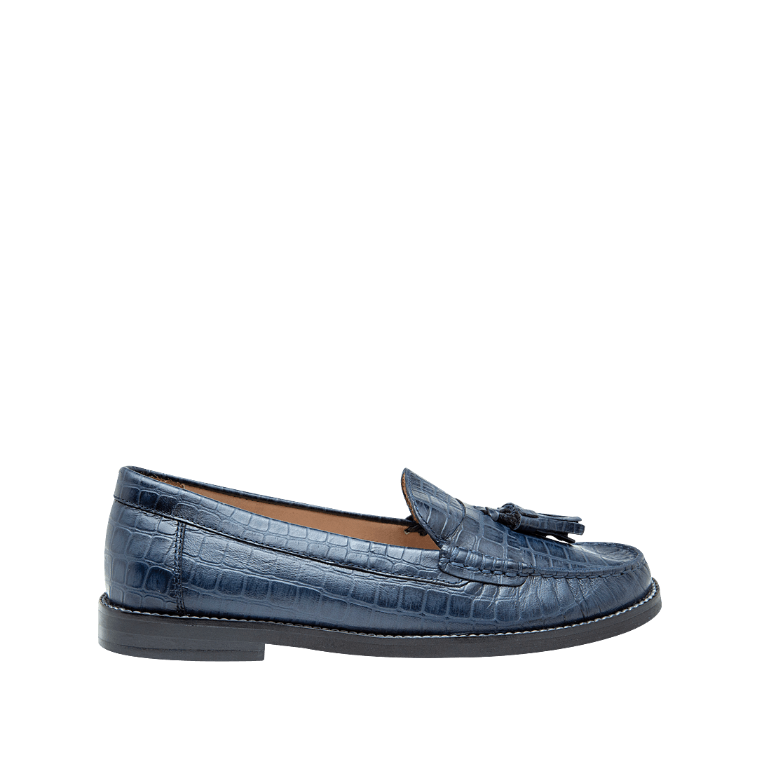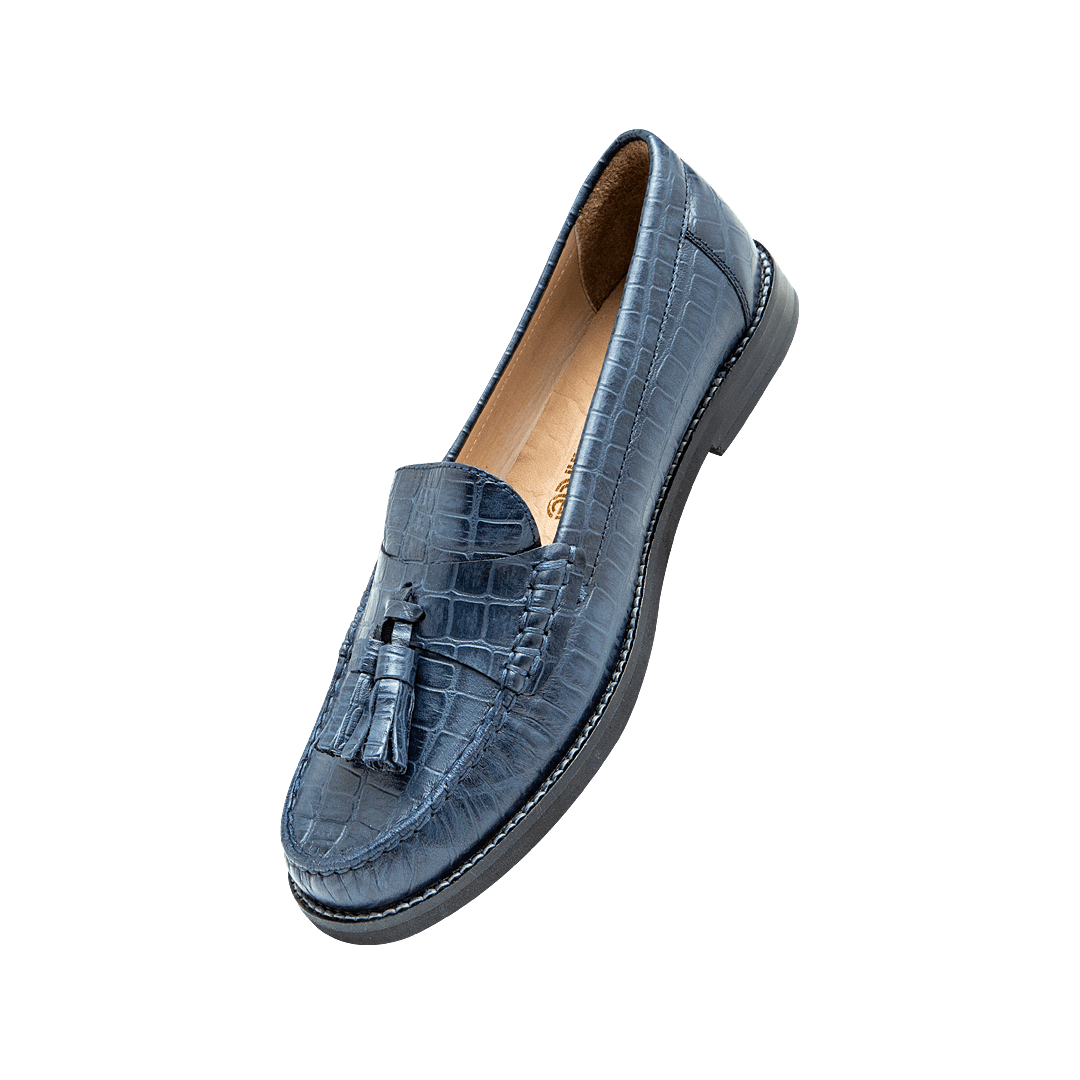 ¡Clásicos que nunca pasan de moda! • Mocasín para mujer en cuero grabado color azul profundo • Acabado en punta redonda • Flecos decorativos en la capellada • Hecho a mano en Colombia.