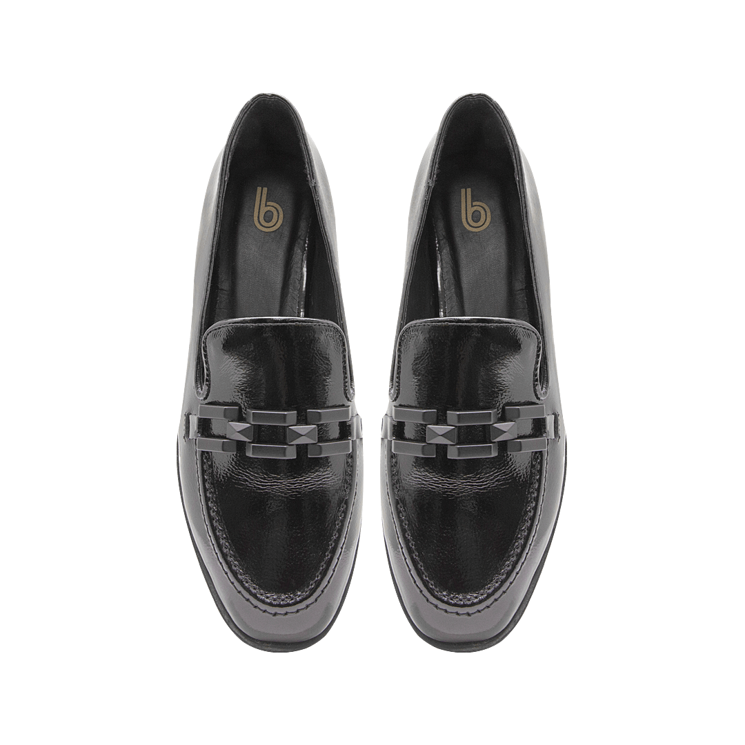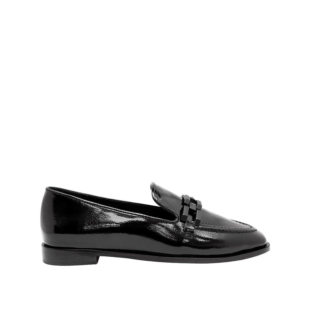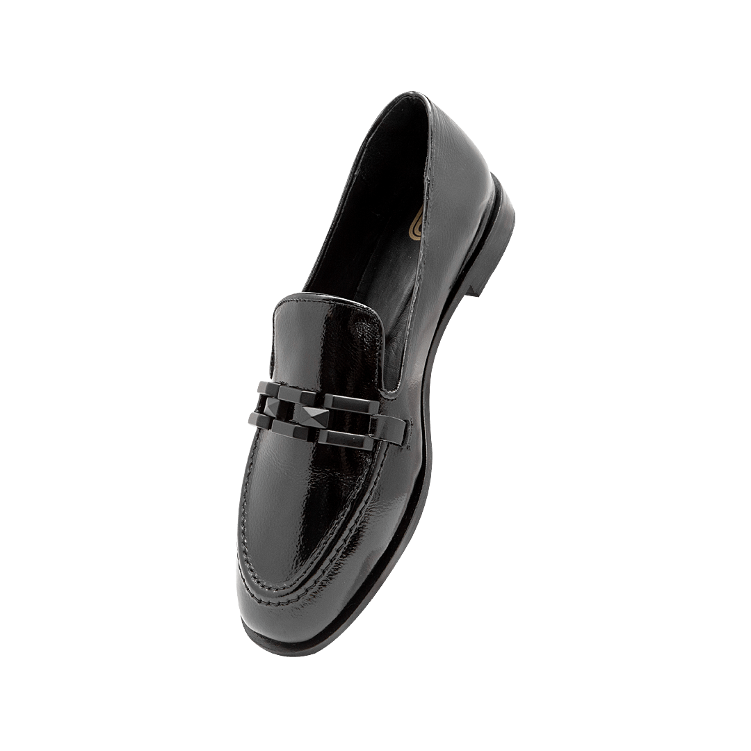 ¡No pierdas de vista los clásicos! • Mocasín en cuero charolado color negro ónix • Punta ovalada • Cadena en la capellada • Hecho a mano en Colombia.