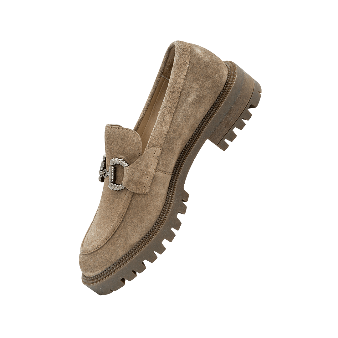 ¡No pierdas de vista los clásicos! • Mocasín en cuero gamuza color almendra • Bridón en la capellada • Tacón cuadrado en madera • Hecho a mano en Colombia.