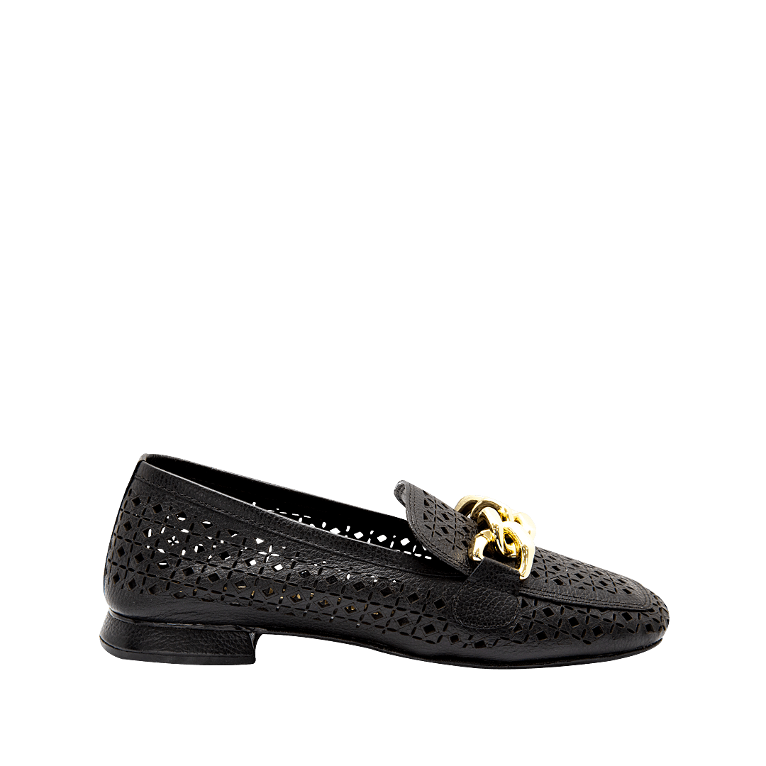 ¡Imprescindible para el día a día! • Mocasín para mujer en cuero perforado color negro ónix • Cadena decorativa en la capellada • Acabado en punta cuadrada • Tacón cuadrado forrado en cuero • Hecho a mano en Colombia.