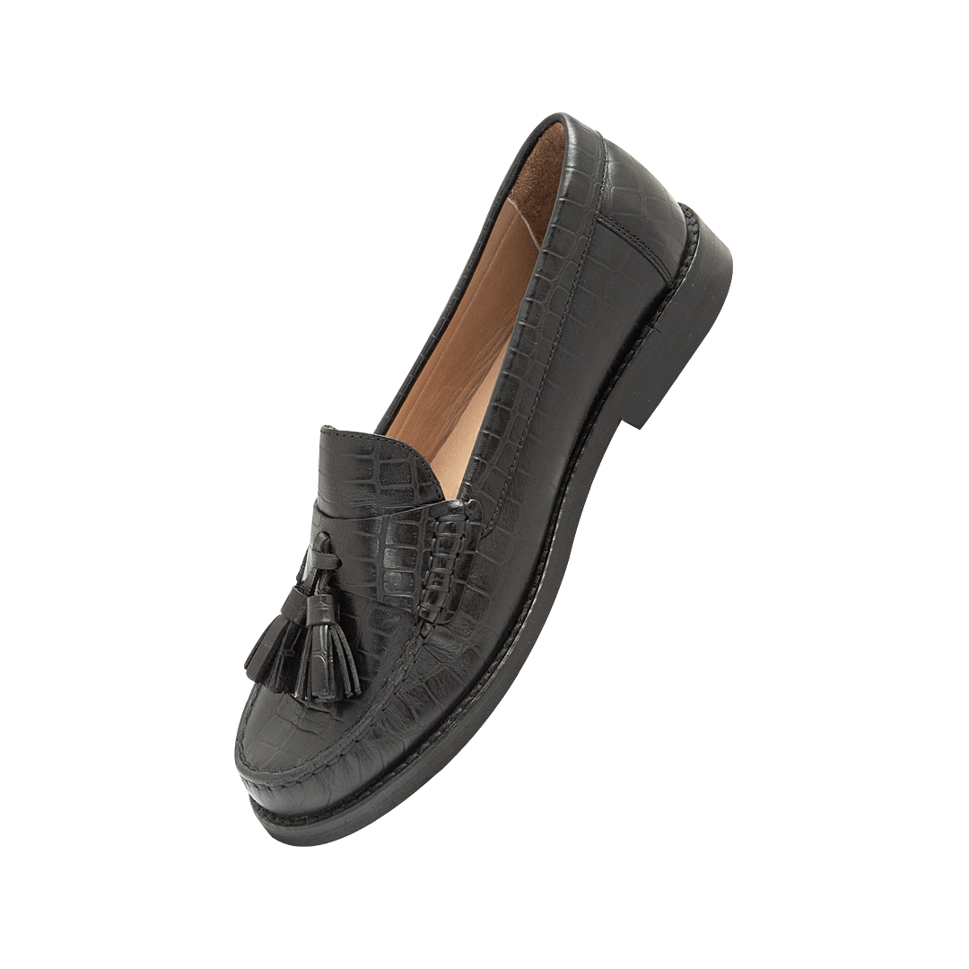 ¡Clásicos que nunca pasan de moda! • Mocasín en cuero grabado color negro ónix • Acabado en punta redonda • Flecos decorativos en la capellada • Forro en piel • Hecho a mano en Colombia.
