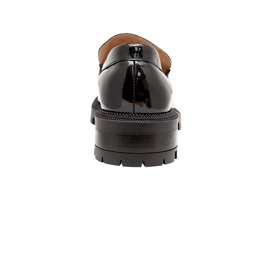 ¡No pierdas de vista los clásicos! • Mocasín en charol color negro ónix • Bridón en la capellada • Plataforma tractorada • Tacón forrado en madera • Hecho a mano en Colombia.