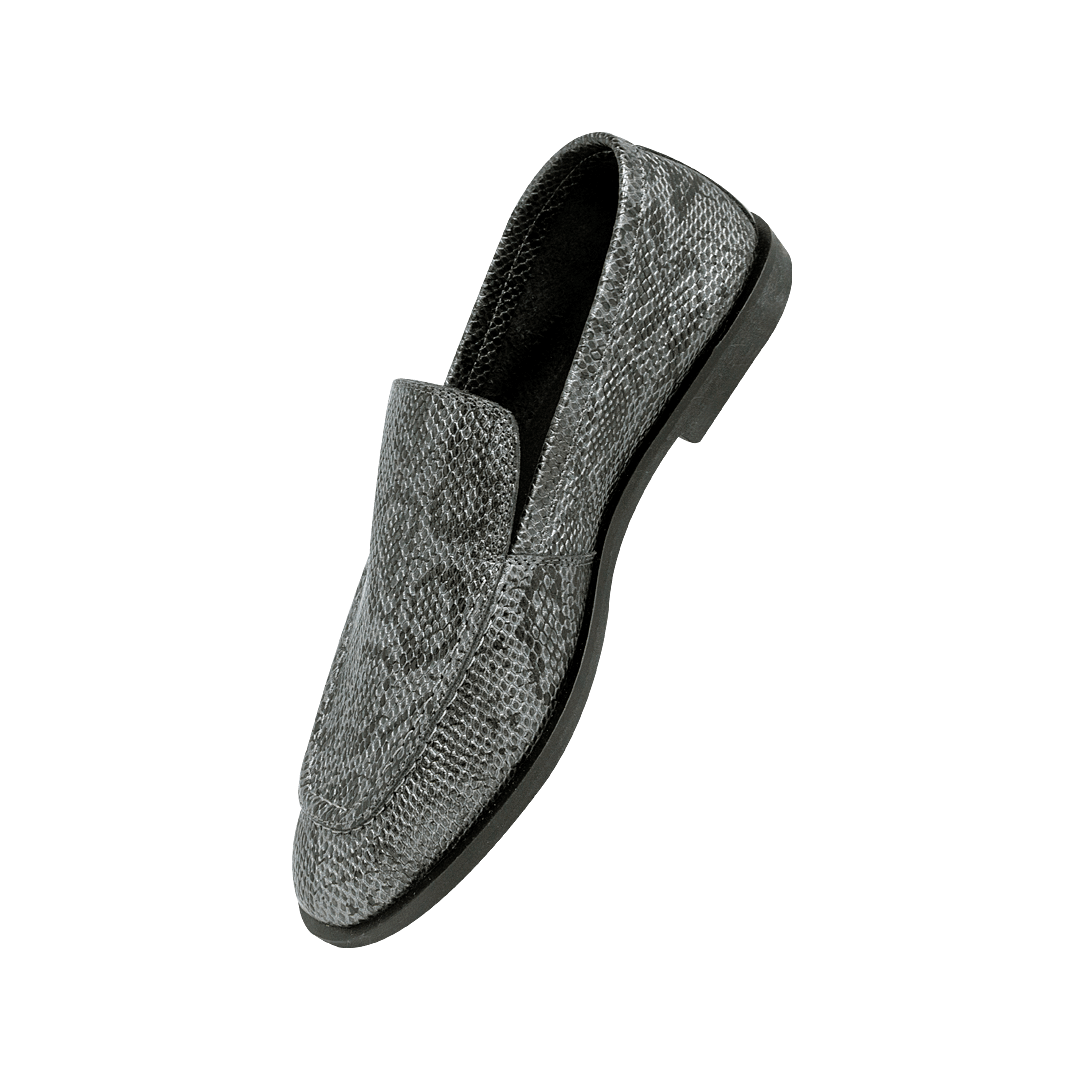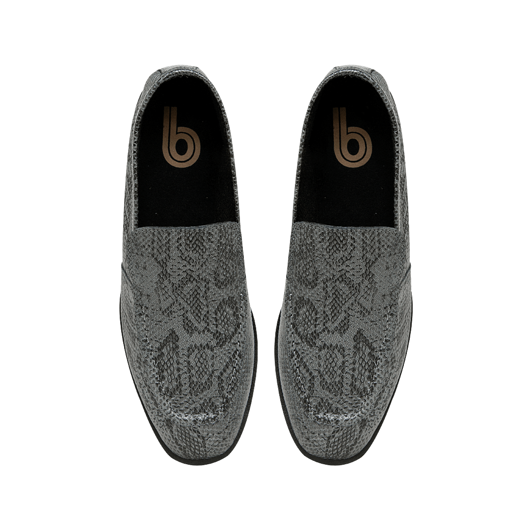 ¡Comodidad, estilo y actitud! • Mocasín para mujer en cuero grabado y estampado imitación pitón color fusil • Acabado en punta semicuadrada • Mini tacón en caucho• Hecho a mano en Colombia.