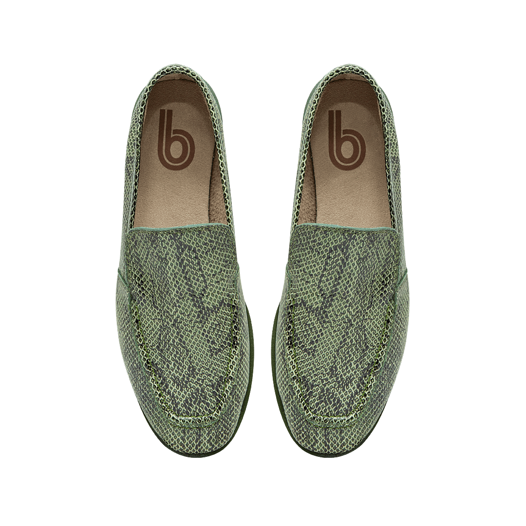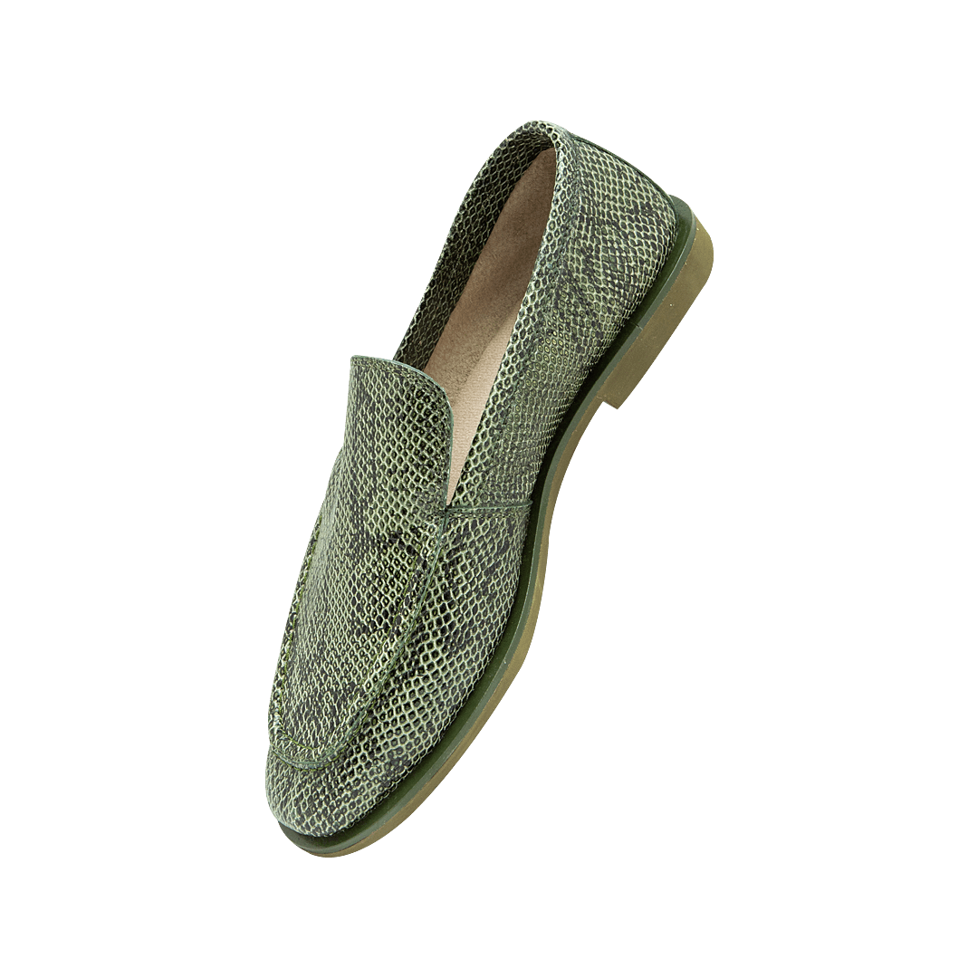 ¡Comodidad, estilo y actitud! • Mocasín para mujer en cuero grabado y estampado imitación pitón color verde militar • Acabado en punta semicuadrada • Mini tacón en caucho• Hecho a mano en Colombia.