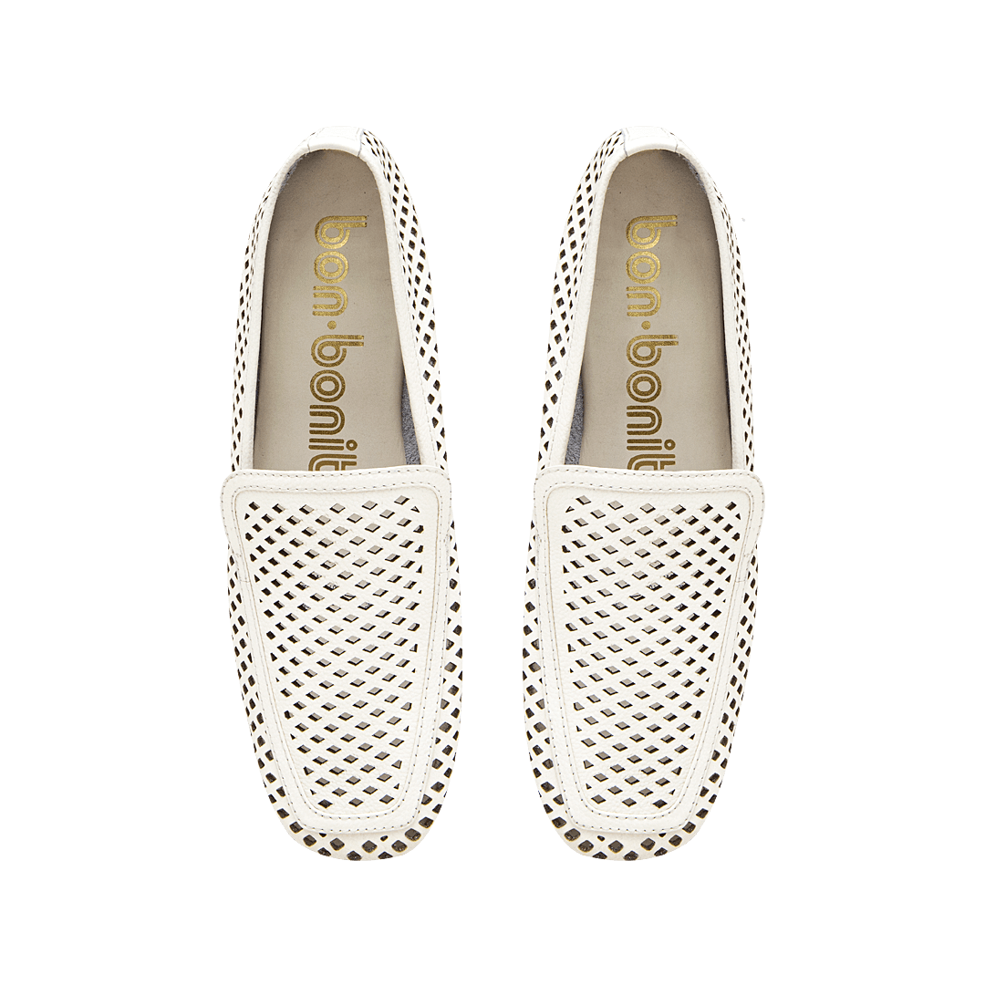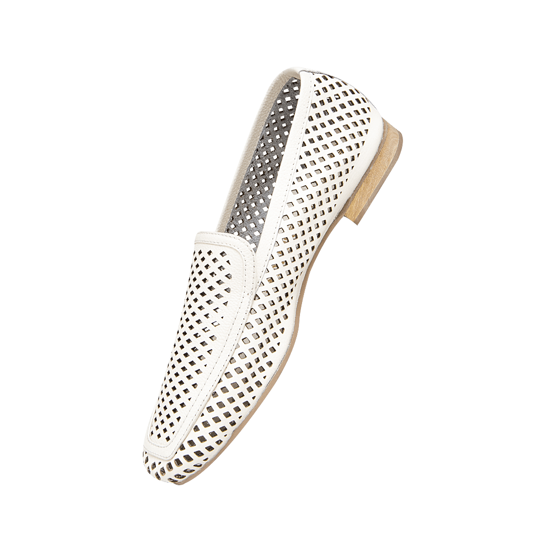 ¡Haz que cada paso se sienta especial! • Mocasín para mujer en cuero perforado color chantilly • Acabado en punta cuadrada • Mini tacón en madera • Hecho a mano en Colombia.