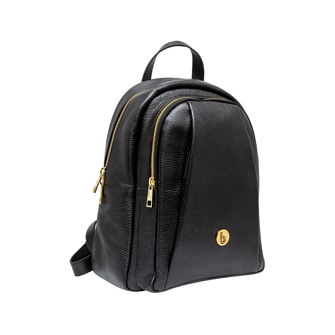 ¡Estilo y practicidad en una sola pieza! • Morral en cuero granito color negro ónix • Cuatro compartimientos externos con cremallera • Bolsillo interno con cremallera • Dos bolsillos auxiliares • Bolsillo trasero con cremallera • Forro en textil • Hecho a mano en Colombia.