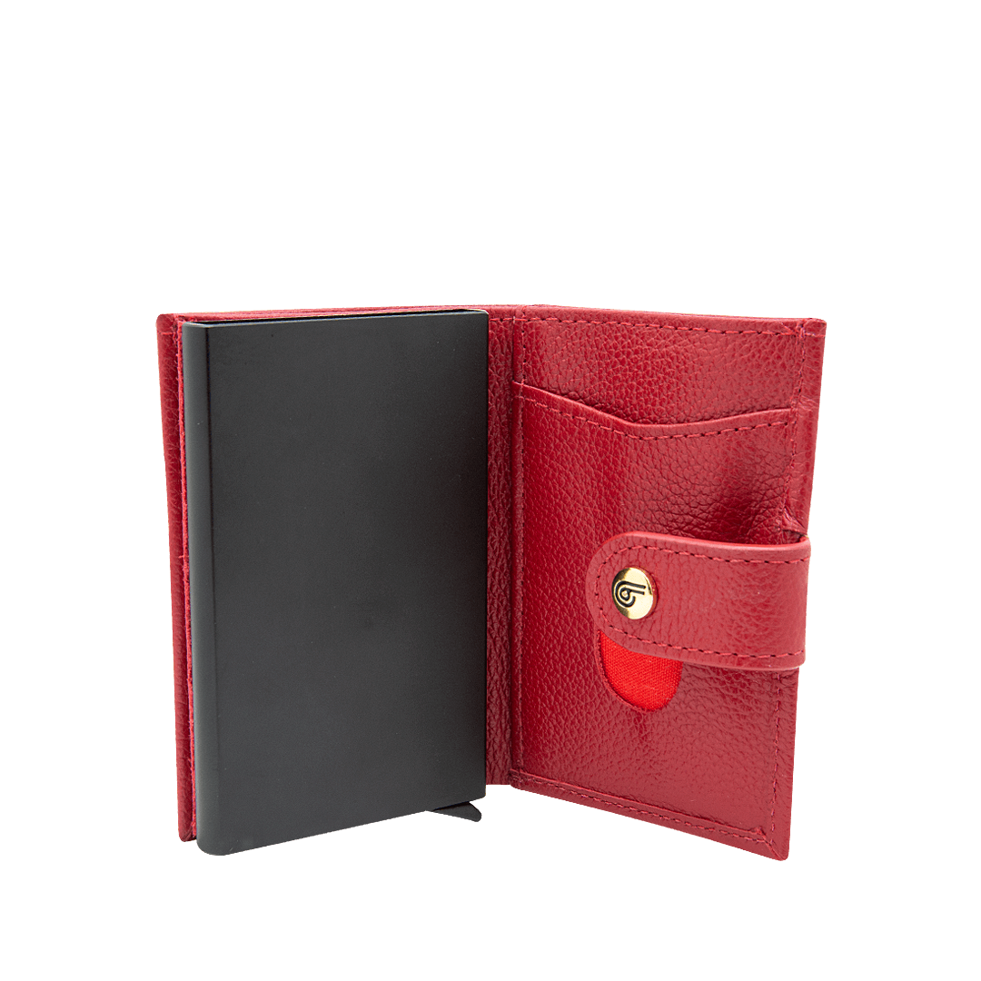 Portadocumentos con botón push de despliegue en cuero rojo escarlata