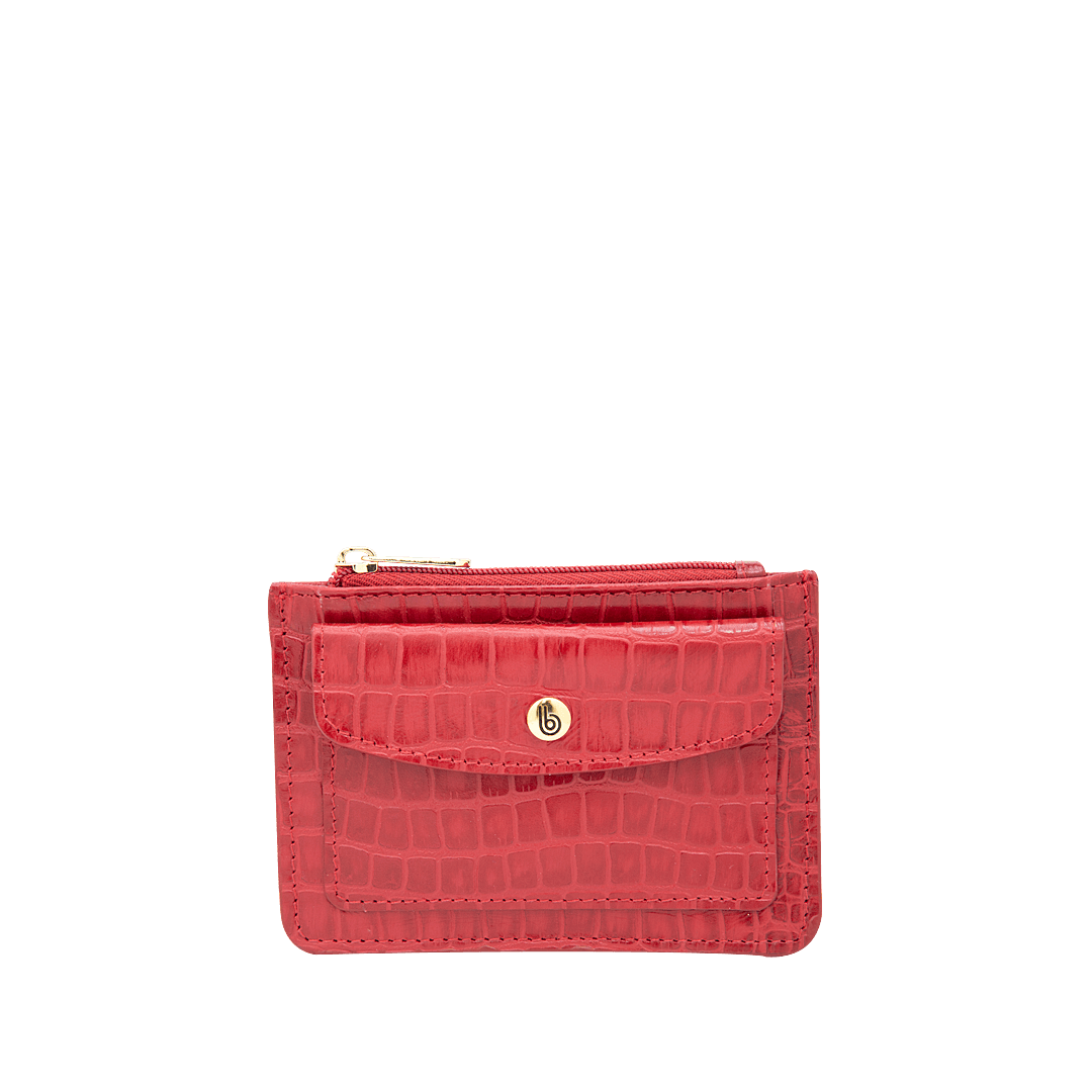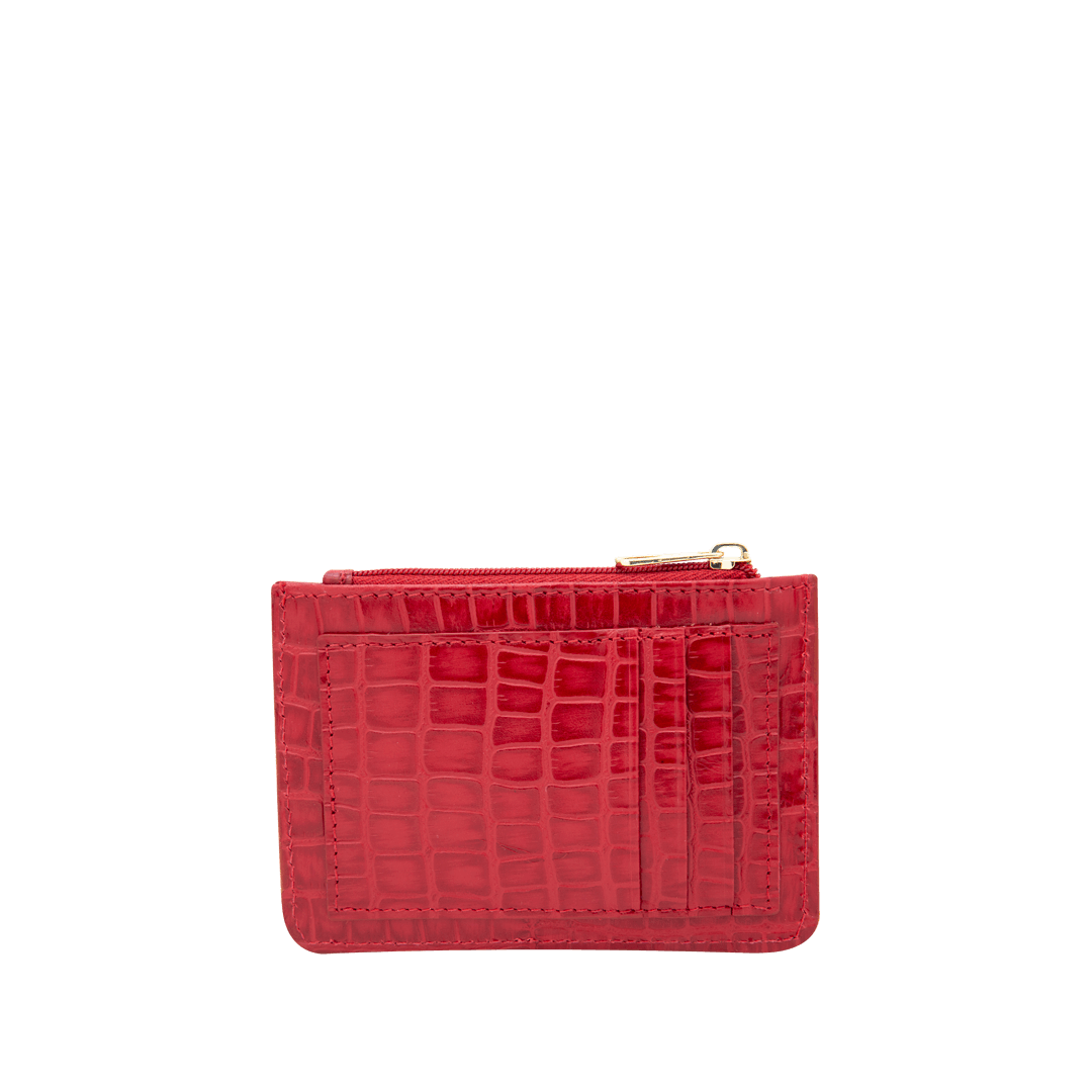 ¡Un accesorio que habla por ti! • Portadocumentos para mujer en cuero grabado color rojo escarlata • Compartimiento frontal con pin • Bolsillo con cierre mediante cremallera • Tres compartimientos traseros para tarjetas • Hecho a mano en Colombia.