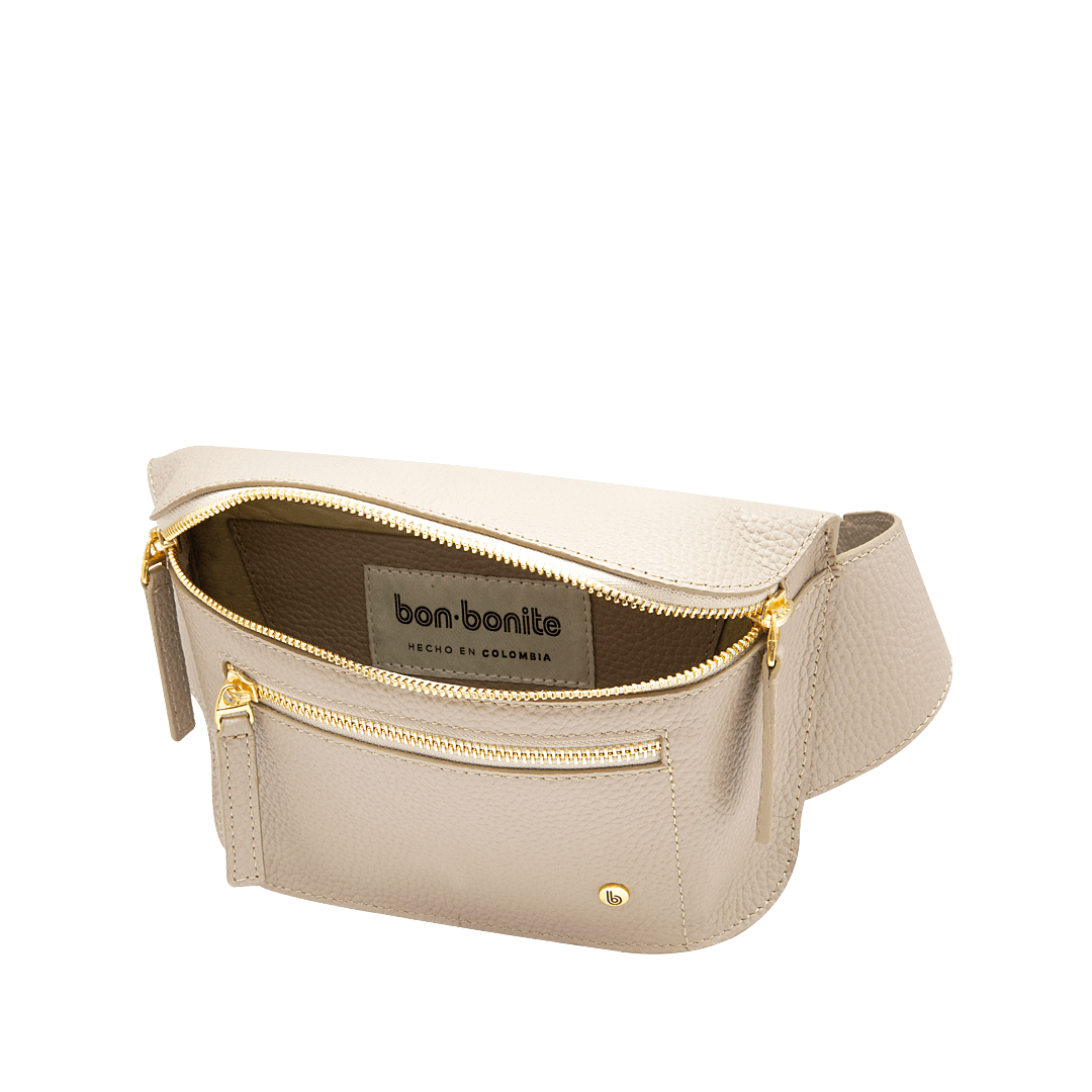 ¡Muévete con libertad y lleva solo lo necesario! • Riñonera para mujer en cuero granito color cacao • Compartimiento frontal con cierre mediante cremallera • Bolsillo interno auxiliar • Asa ajustable de 83 cm • Hecho a mano en Colombia.