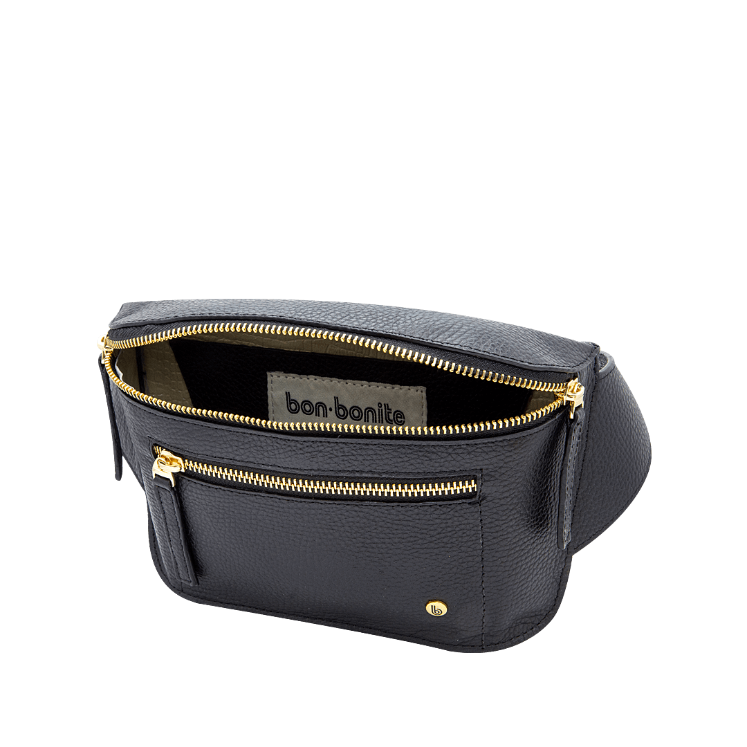¡Muévete con libertad y lleva solo lo necesario! • Riñonera para mujer en cuero granito color negro ónix • Compartimiento frontal con cierre mediante cremallera • Bolsillo interno auxiliar • Asa ajustable de 83 cm • Hecho a mano en Colombia.
